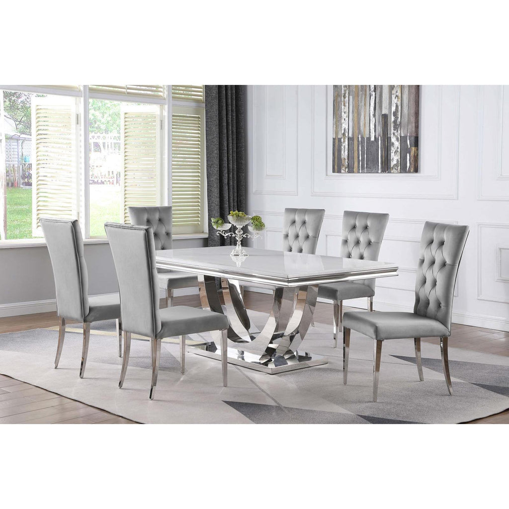 Bring together friends and family at this elegant, modern glam dining table set, featuring a stunning polished chrome finish. A demilune pedestal base offers a spacious faux marble table top that seats up to six comfortably. The Parsons-inspired dining chairs come with comfy seats upholstered in a luxurious velvet fabric that offers a plush look and feel. Each side chair seat offers a supportive and tall button-tufted backrest that fans out at the top. This set includes a dining table and 6 upholstered side chairs.