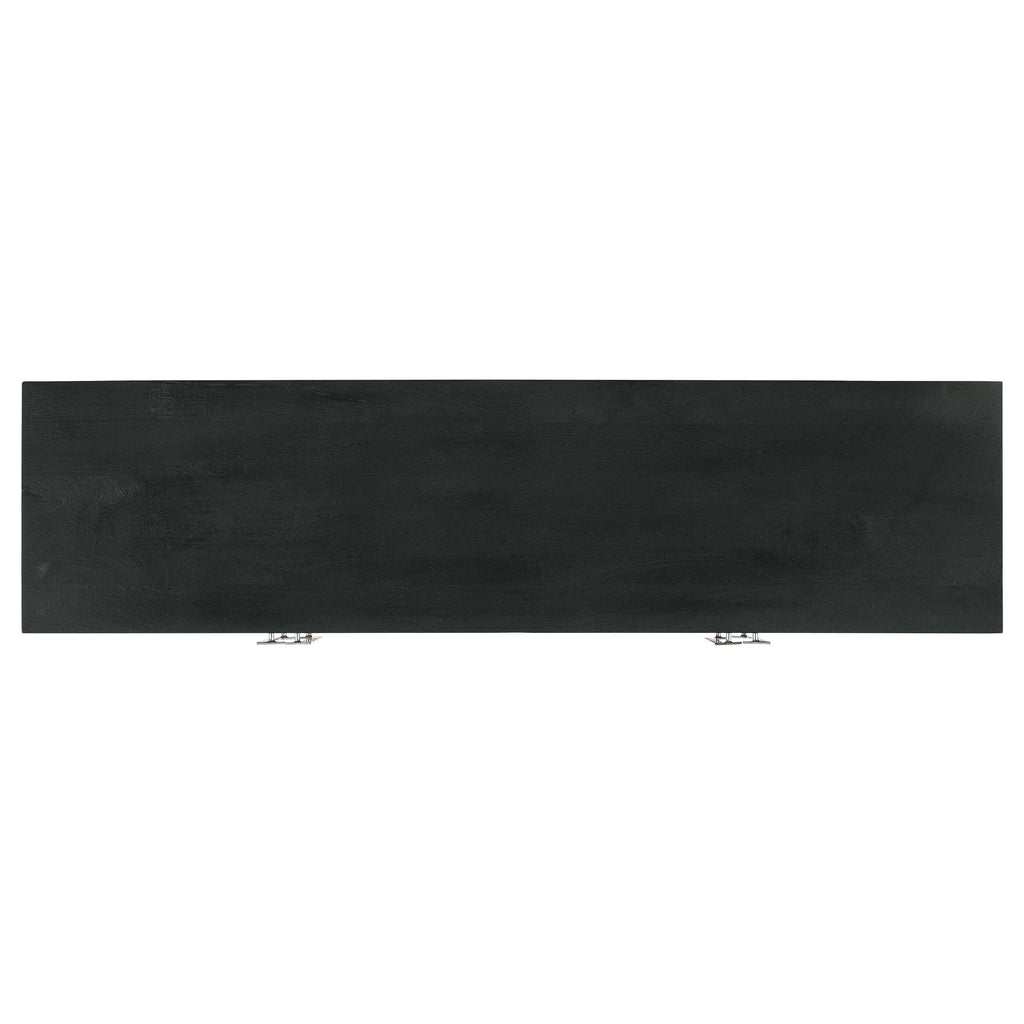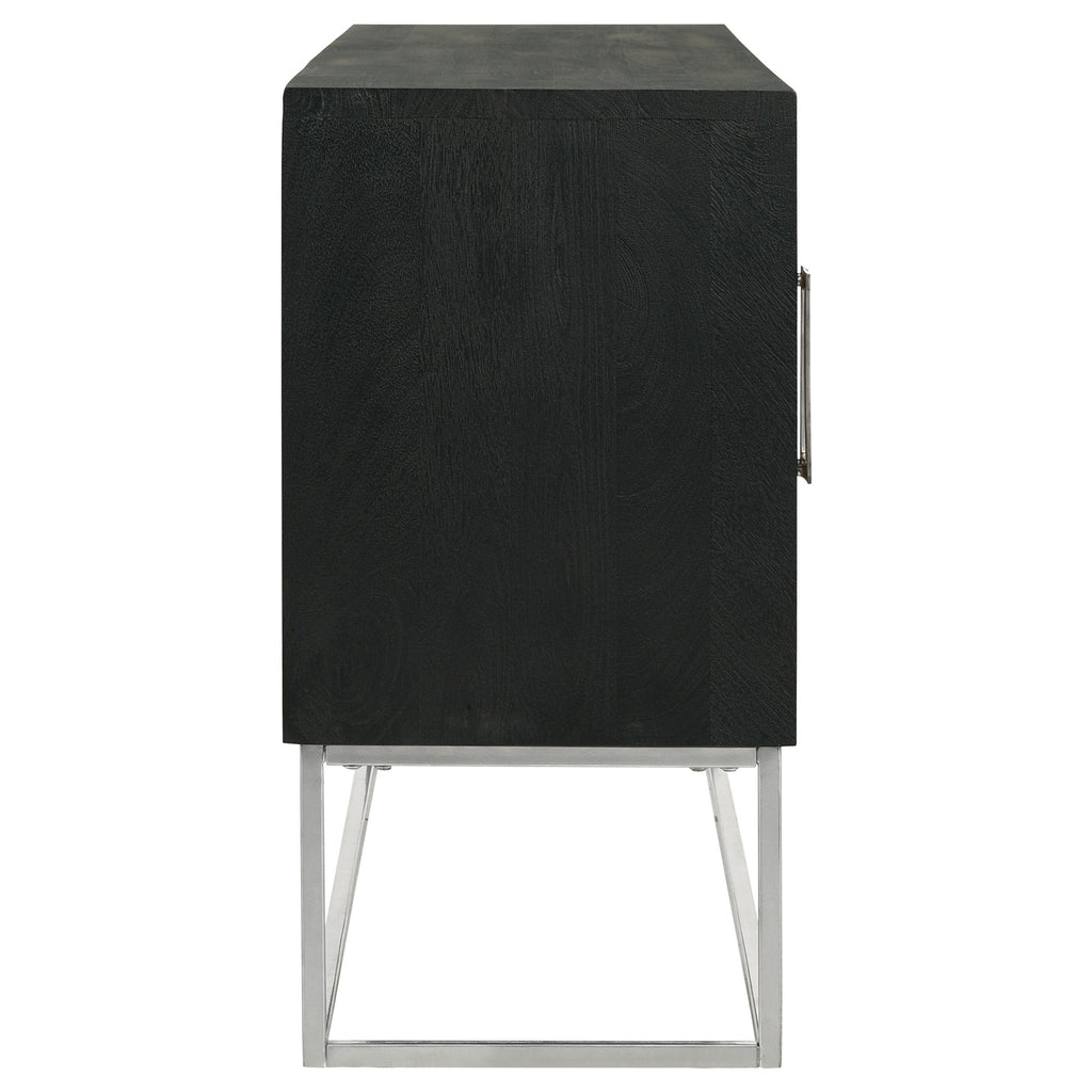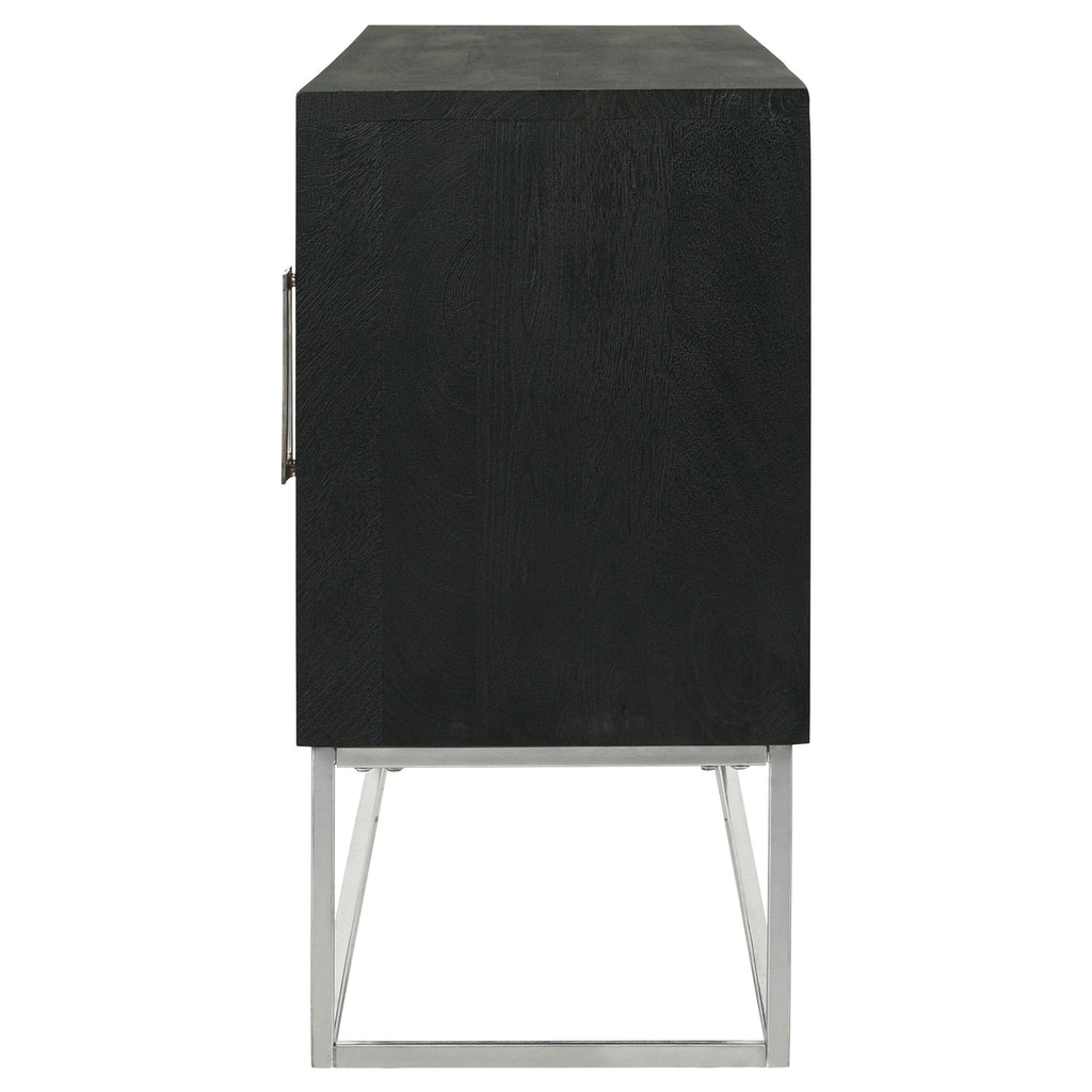 Asian inspiration creates the decadence you seek in outfitting a dining room or living space. This accent cabinet reflects a level of minimalism dressed up with gorgeous finishes to create an exotic ambiance with plenty of function. Rich walnut finish mango wood front panels and a black case offer a mix of smooth and textured effects, as a bracket-style iron frame and matching door hardware create a compelling palette. Find space on two fixed interior shelves behind each set of doors to store dishes, serve ware, or anything that needs to be tucked away. Smooth drawer closure is possible thanks to magnetic closures.