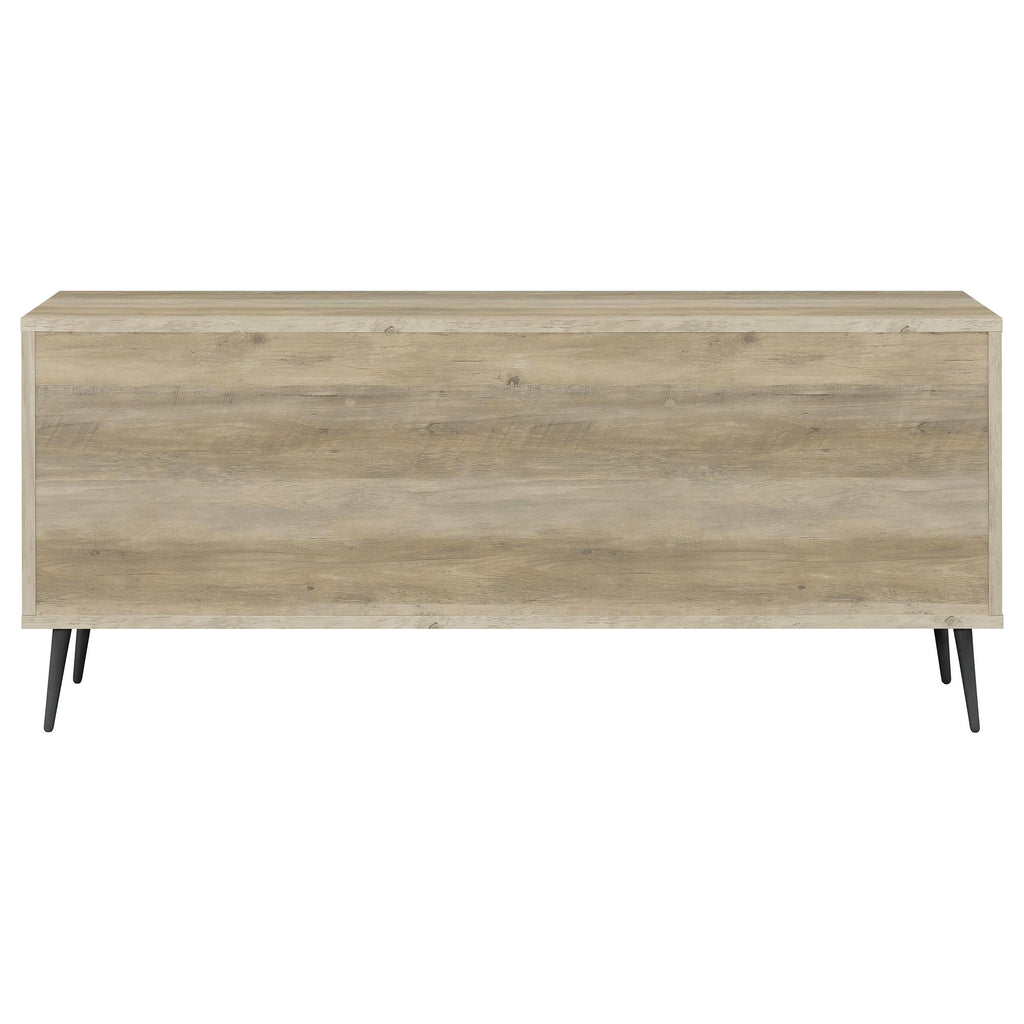Light, airy energy and minimalist Scandi design combine to create a chic storage solution for any room. A modern accent cabinet features a pine wood finish case that's cool and neutral, perfect for a living or dining room. Door and drawer fronts add a contrasting antique gray finish that's rich and elegant, offering contrasting color and style for a stand-out look. Two doors open to reveal two shelves, great for everything from dinnerware to clothing and accessories. Three drawers create the perfect spot for smaller items, adding organization in an entry or home office.