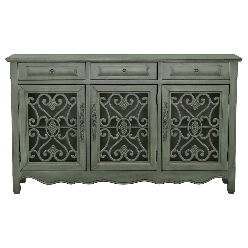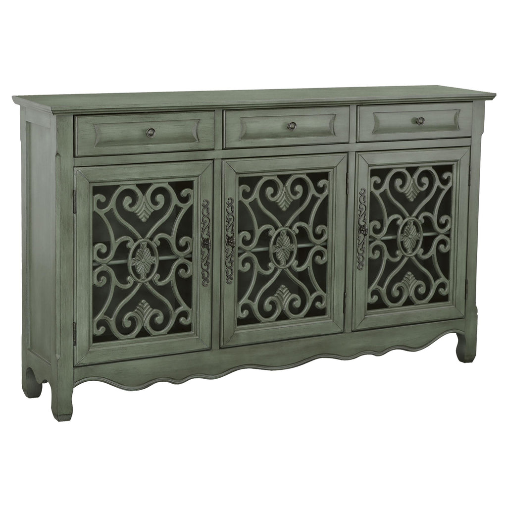 • Traditional three door accent cabinet in antique green finish offers a timeless conversation piece