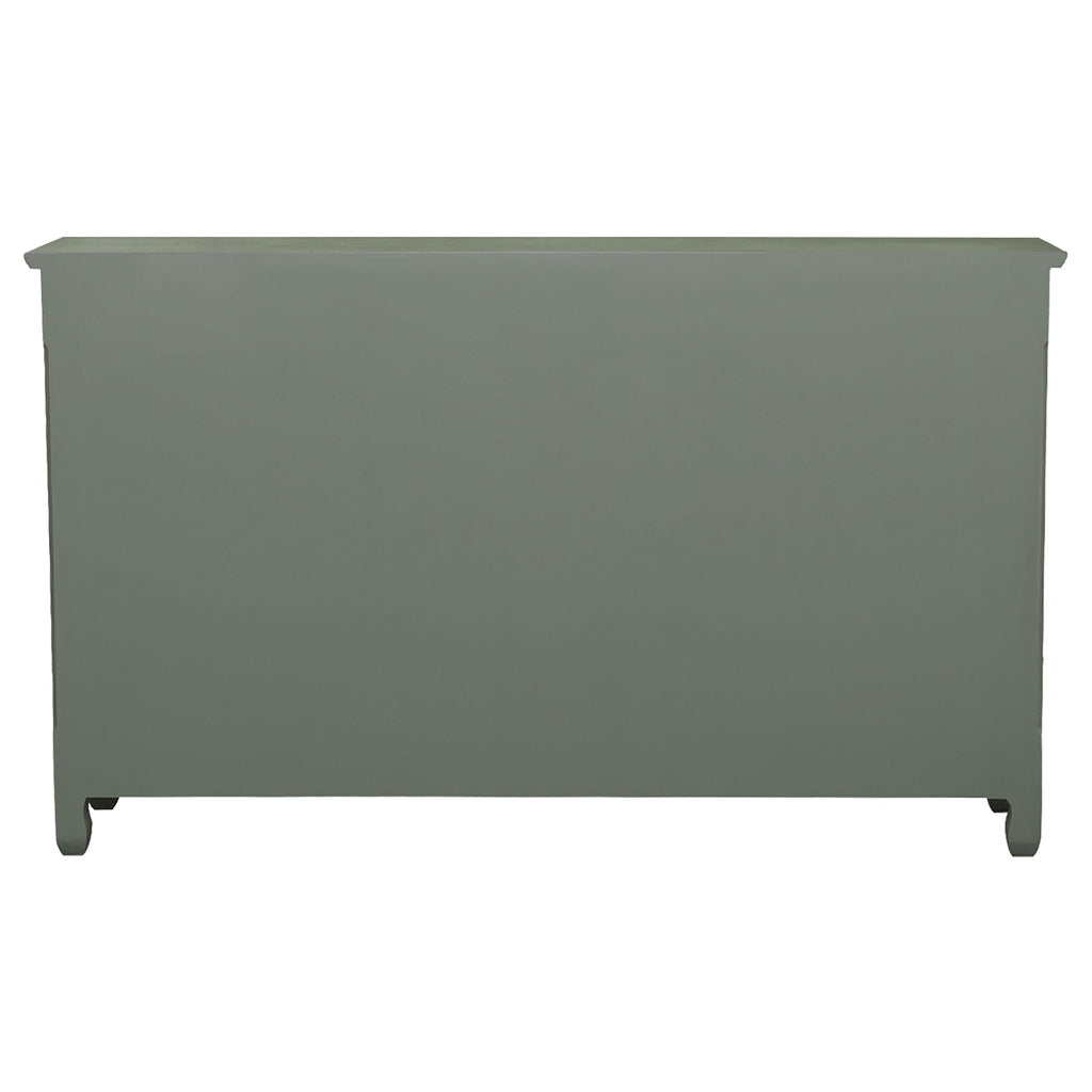 Celebrate color and romantic design embellishments. Perfect for a traditional space, this accent cabinet blends a cottage motif with an early 20th century aesthetic. Lovely antiqued green offers a blush of cool color, embellished with bronze hardware on its doors and drawers. A scalloped bottom edge and rounded feet bring a charming look. Find plenty of space to store and display decor, serveware, and miscellaneous gadgets.