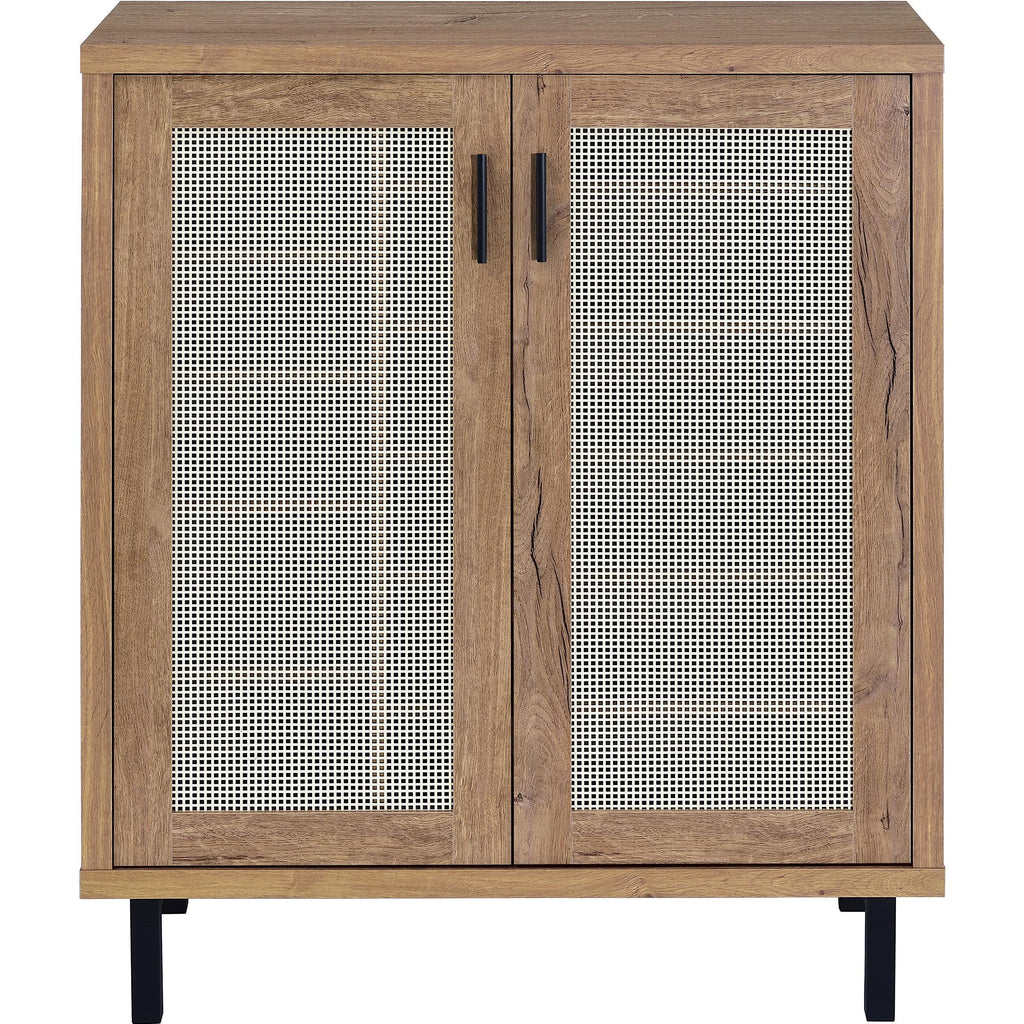 Enhance your entryway with this stylish shoe cabinet, pairing natural oak hues with modern, functional details. Crafted from engineered wood and laminate veneer, it features double doors framed by airy metal cane-style panels. Inside, an off-centered division and multiple adjustable shelves accommodate various shoe sizes, ensuring a personalized storage solution. Sturdy black metal legs anchor the piece, delivering a contemporary look that effortlessly streamlines your footwear collection.