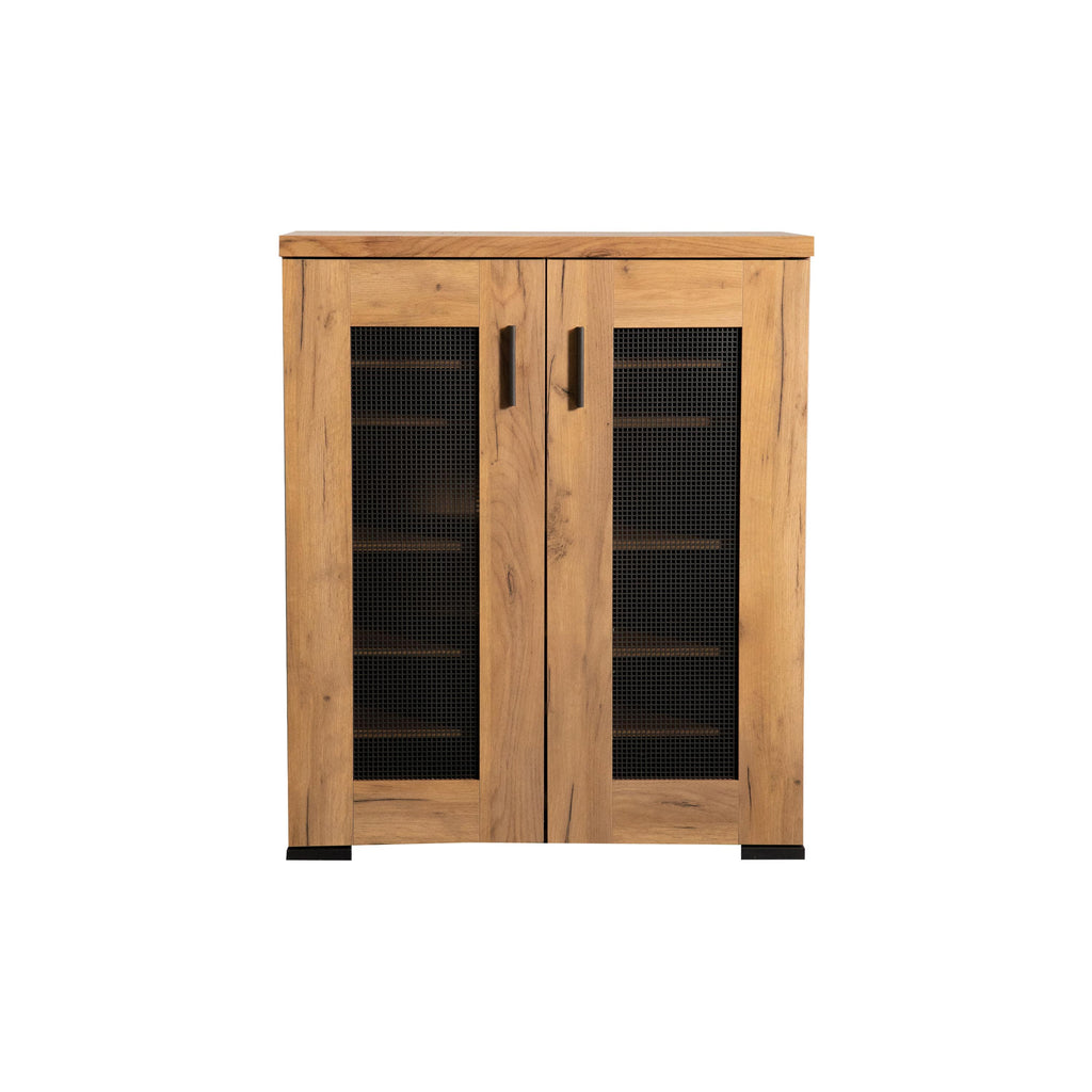 Organize your shoe collection inside this two-door rustic style shoe cabinet. The golden oak finish creates an attractive appeal in entryways and mudrooms. The gunmetal mesh door panels make for a striking contrast. Sleek bar pulls match the block style feet. Use this piece for your shoes or general storage needs.