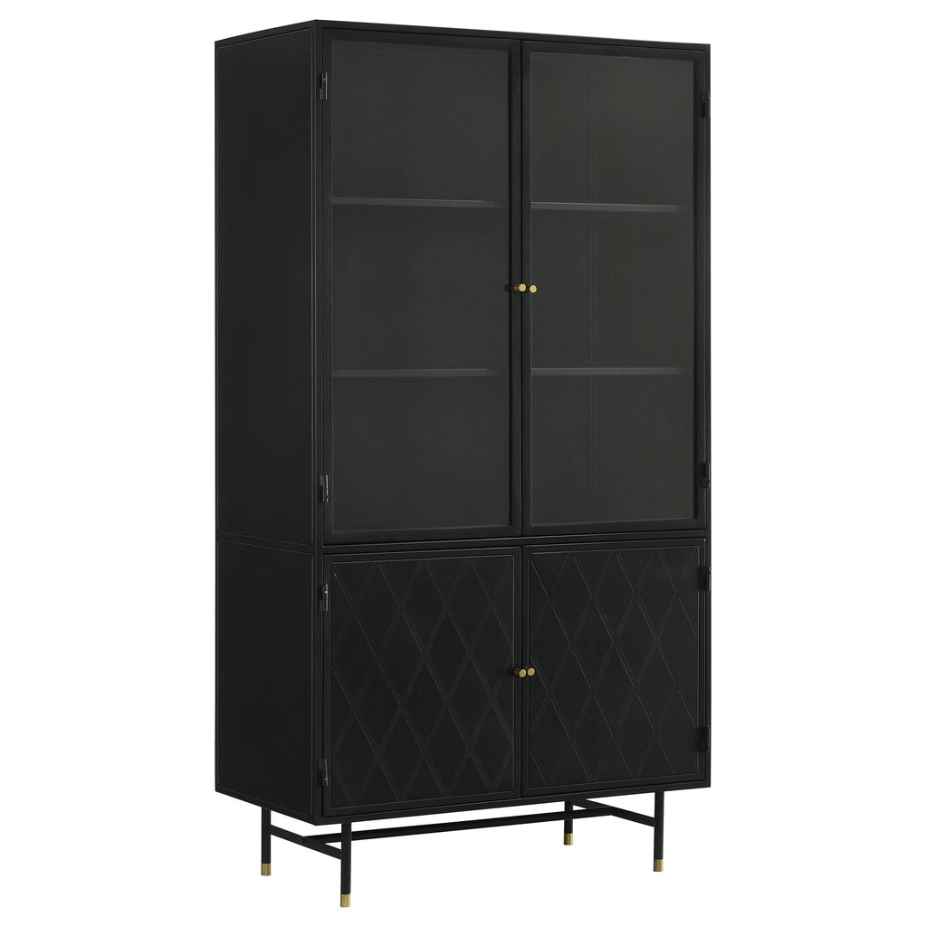 This industrial style metal cabinet offers ample storage space and a bold look in a space. With its matte black finish and accents of antique brass finish hardware, the cabinet offers a subtle contrast while exhibiting style and grace. With its tall design and rectangular shape, this cabinet takes up minimal floor space, bringing the eye up to showcase decor and collections behind tempered glass doors. Adjustable shelves and interior shelves behind the bottom cabinet keep everything from barware to throws and linens. Resting on a trestle base with legs capped in a matching antique brass finish hardware, this elegant and stately accent cabinet offers a touch of glam too.