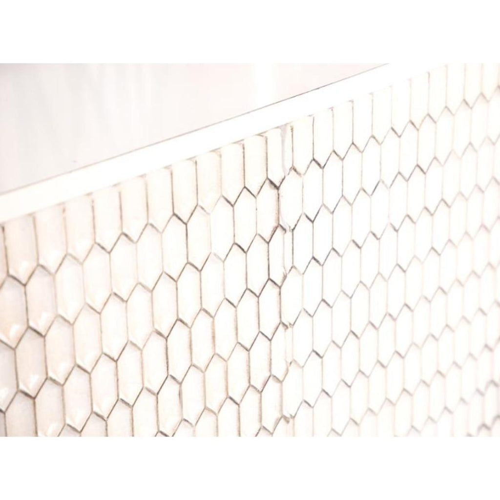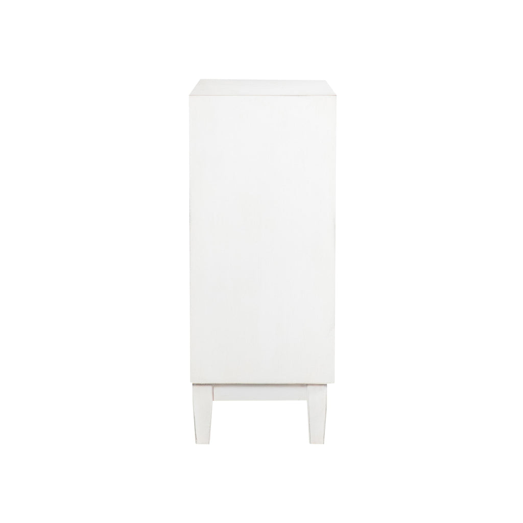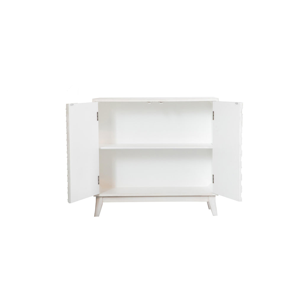 A marvelous accent cabinet is ready to enhance your modern living area. The white finish is enhanced with a striking geometric pattern for visual appeal and texture. The cabinet doors conceal one interior shelf for storing your essentials. Your new accent cabinet is supported on stunning angled legs. Add it to your entryway to elevate your decor.