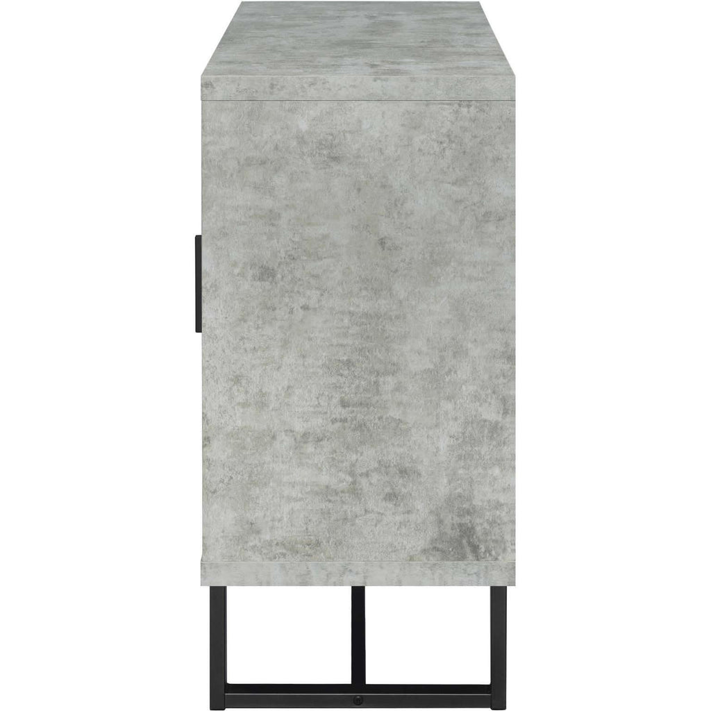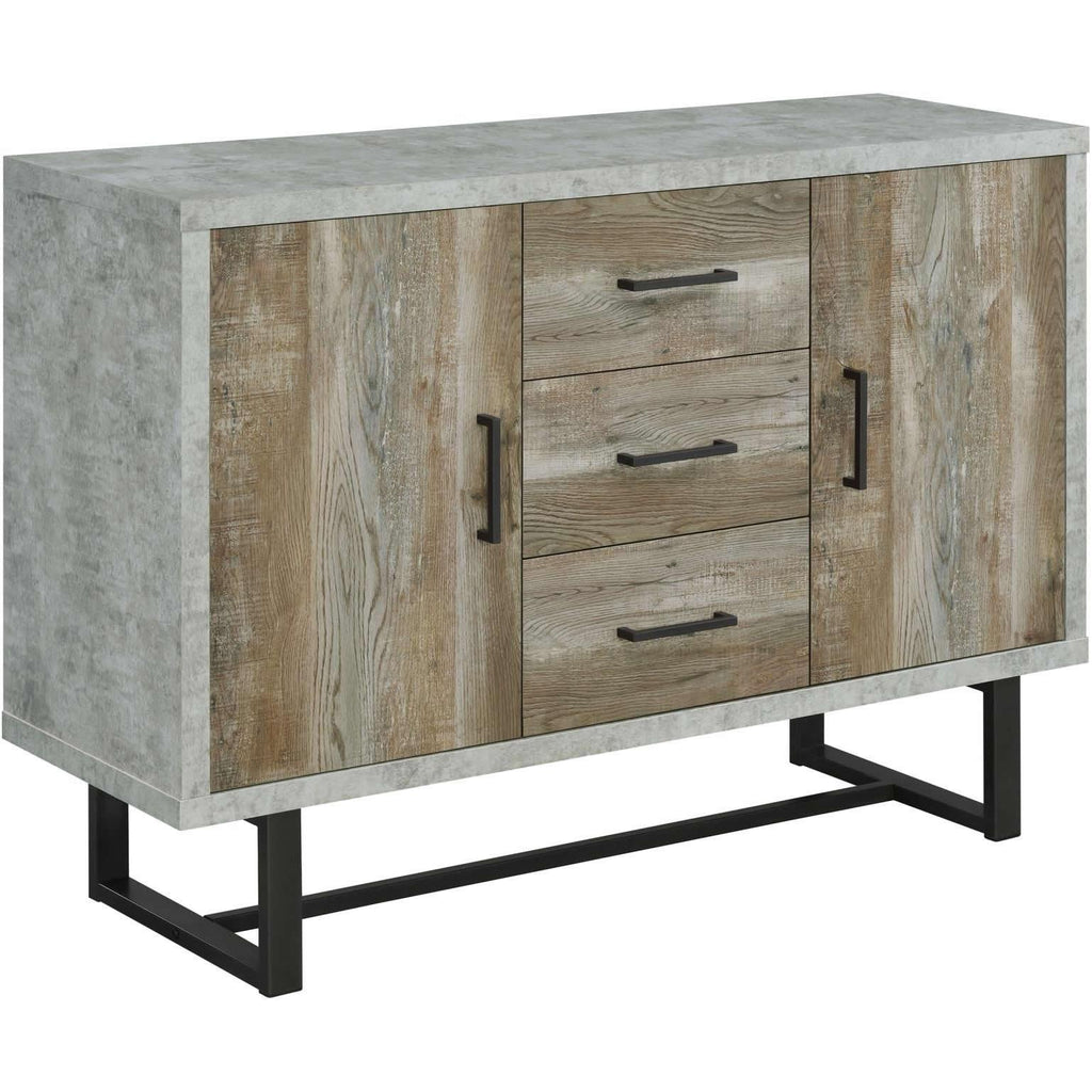 Rustic elements and industrial touches complete with overall minimal style of this contemporary accent cabinet. An outer edge of a faux cement finish reflects the gray undertones of the weathered oak drawer and cabinet panels. With a bold contrast and expressive accent, the gunmetal pulls mimic the U-shaped design of the trestle base that supports this elegantly understated accent cabinet. Perfect for organizing essentials, the interior features two shelves tucked behind the doors, while three spacious drawers keep other items. Place this charming accent cabinet in a modern dining space or living room for a hint of country flair.