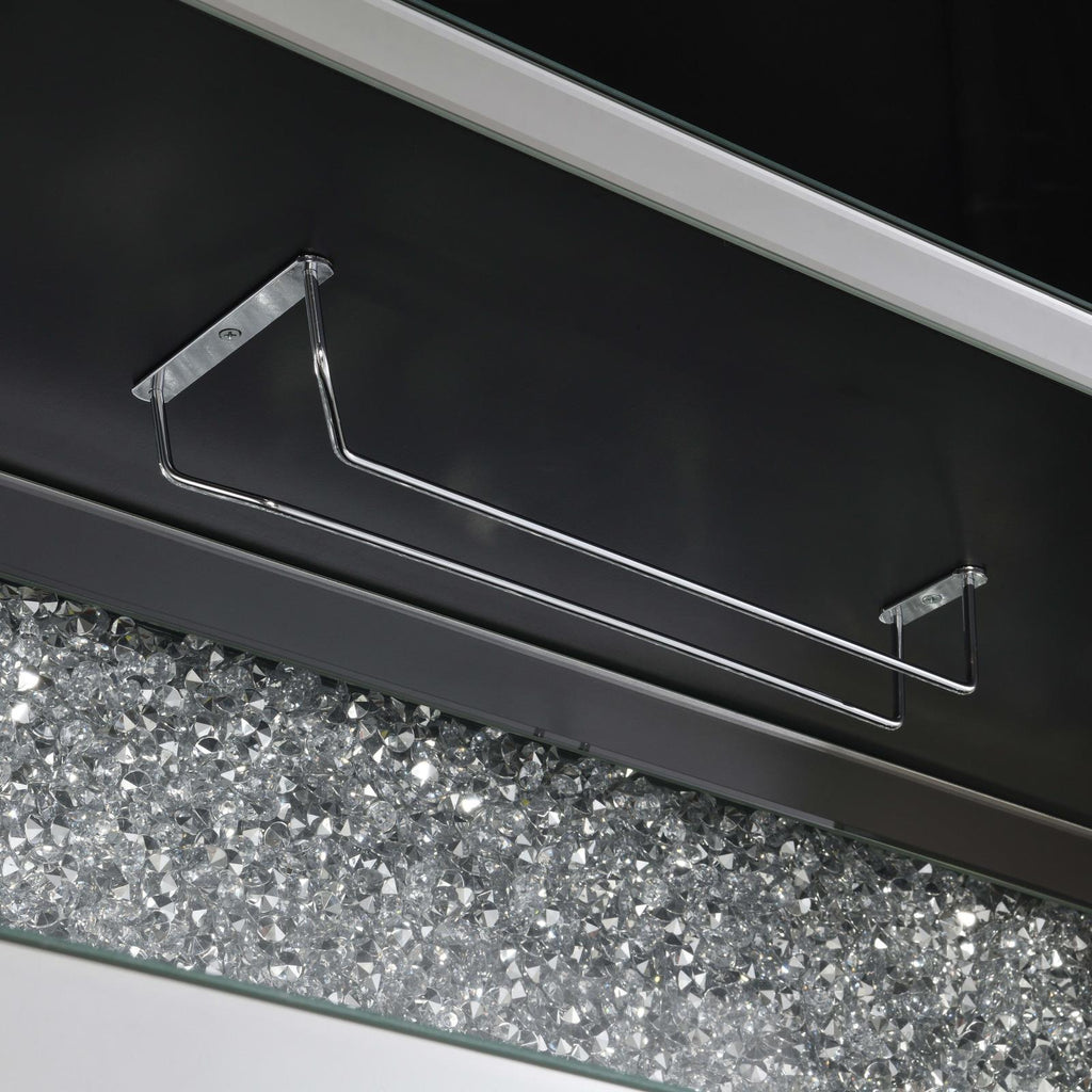 This wine cabinet is a striking statement piece that features a highly reflective surface made of mirror tiles and trim. The faux diamond encrusted doors and crystal knobs add a hint of sparkle while the open back shelf emits a soothing glow. This spacious rectangular frame is perfect for creating a dramatic effect on any focal wall.