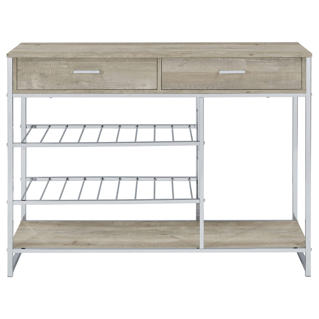 Your entertaining needs are filled with a sense of casual style and supreme organization as this bar cabinet provides space and configuration for a casual space. Make serving a breeze with a cabinet featuring gray finish wood products construction of an upper two-drawer cabinet and matching lower shelf. Minimalist metal framing adds a great optical benefit, with two slat shelves that accommodate dishware and stemware. Drawers open easily to make space for implements. This all-in-one bar cabinet offers a fresh, clean look and lots of convenience to organize an entertainment regimen.