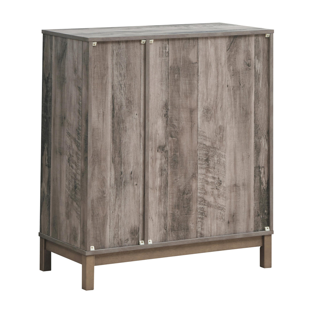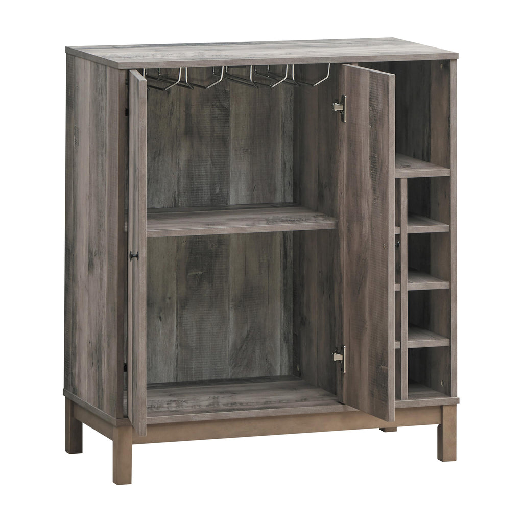 Perfect for compact homes comes this rustic wine cabinet. With a weathered Acacia wood-like finish over the frame, this wine cabinet lends itself to modern farmhouse style living rooms and dining rooms. On the right side are eight wine bottle storage cubbies, along with an open space for storing extra wine accessories. On the left side is a double-door cabinet that hides away all your items neatly inside, with the help of four stemware racks and two open shelves. Each cabinet door also features a matte black round pull that lends a modern flair.