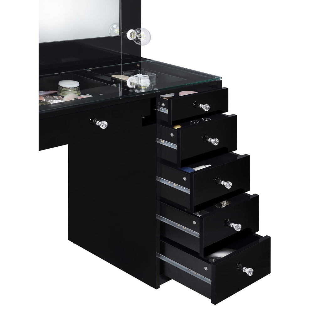 Create space for all your makeup, skincare and hair needs with this contemporary lighted vanity table and mirror. A sleek, fresh look, it boasts a glass top that allows you to see items placed in top drawers. Seven drawers total create easy opportunity for organization of all your products. A cabinet adds adjustable shelving for larger items. The mirror is lighted on three sides, offering multi-directional illumination for even lighting as you apply makeup or fix your hair.