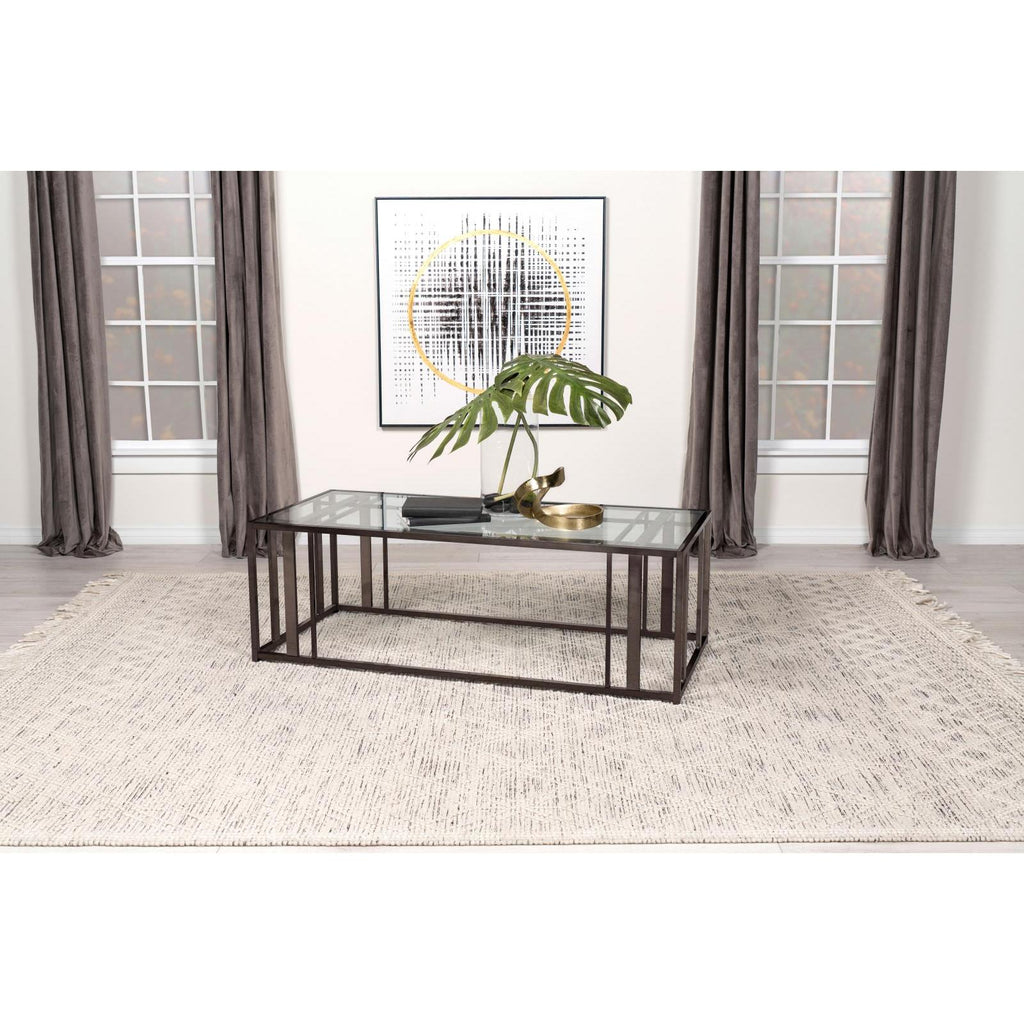 This modern rectangular coffee table features a clear tempered glass top paired with a geometric base made from heavy-gauge metal with a sleek electroplated finish. The open design offers a contemporary aesthetic, blending elegance with durability. Perfect for displaying decor or organizing essentials, its scratch-resistant materials ensure lasting quality. The compact design makes it an ideal addition to any living room, lounge, or small space.