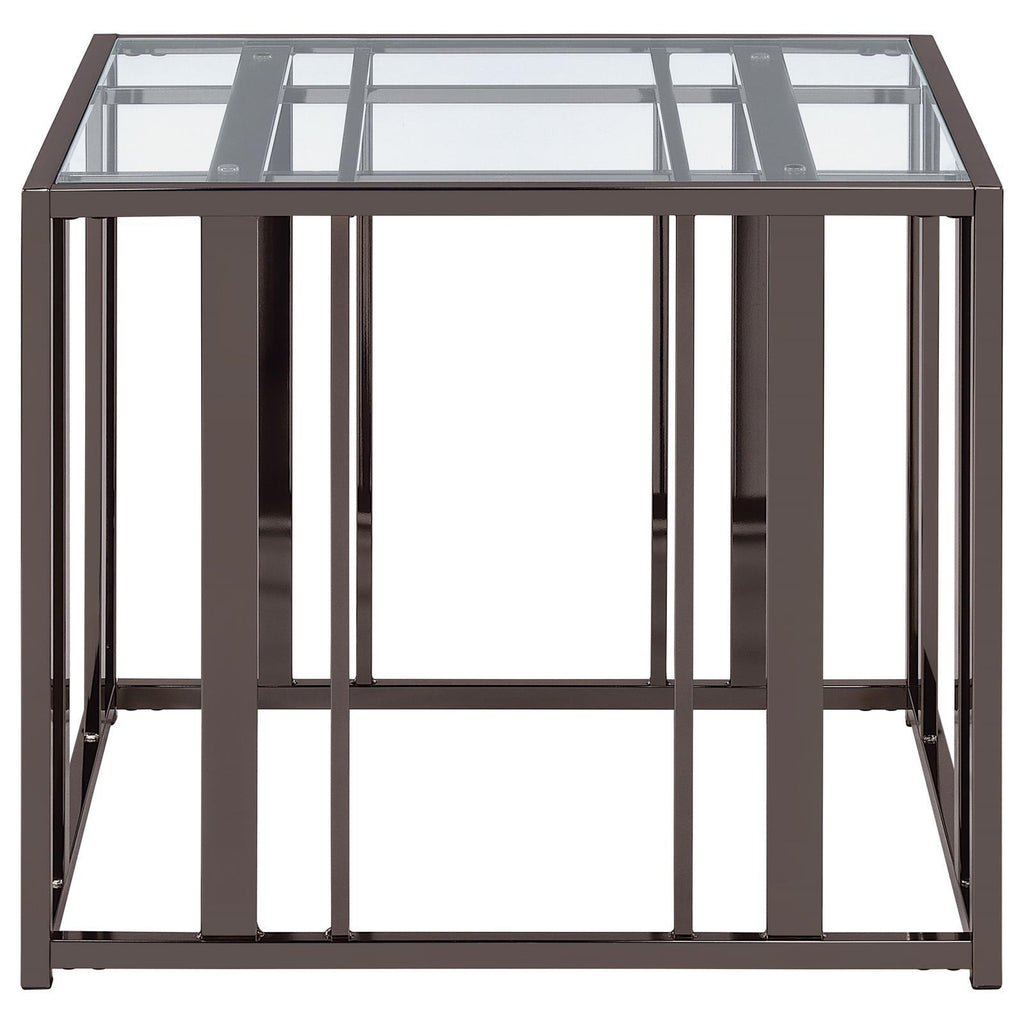 This modern side table features a tempered glass top paired with a geometric base in heavy-gauge metal with a sleek black nickel electroplated finish. The open design offers a contemporary aesthetic, blending elegance with durability. Perfect for displaying decor or keeping essentials within reach, its scratch-resistant materials ensure lasting quality. The compact design makes it a versatile addition to any living room or small space.