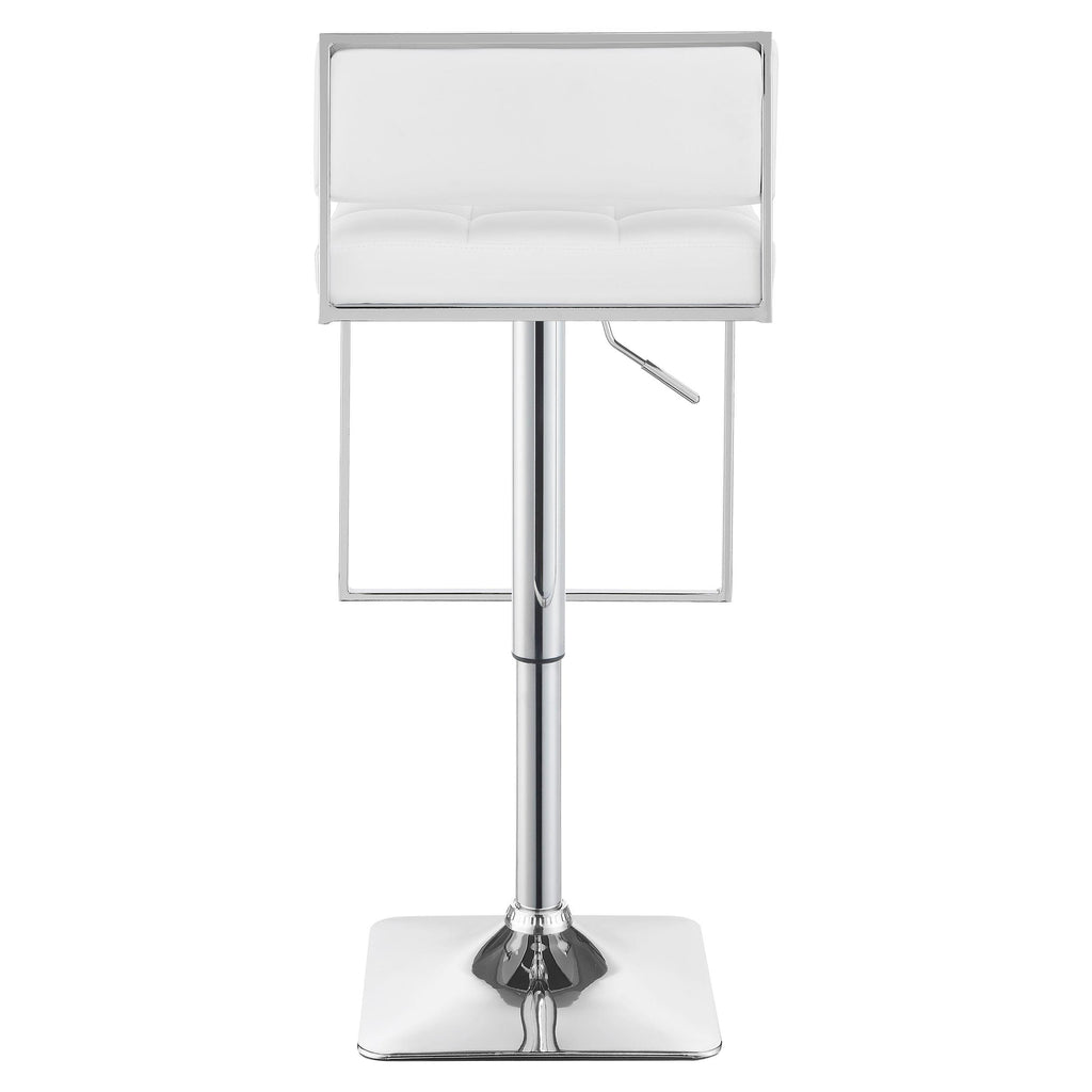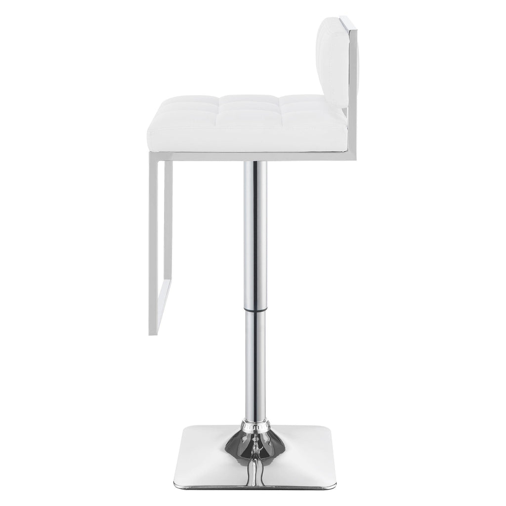 Refresh a modern space with a dynamic accent. A slender silhouette makes this bar stool perfect for a redesigned contemporary kitchen or dining space. Sleek white upholstery with channeling covers linear designed cushions. Chrome finish metal forms a base and cool U-shaped footrest. Adjustable seat heights conform to a coordinating pub table or counter.