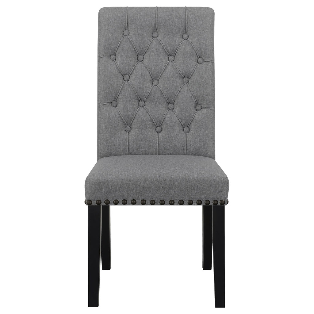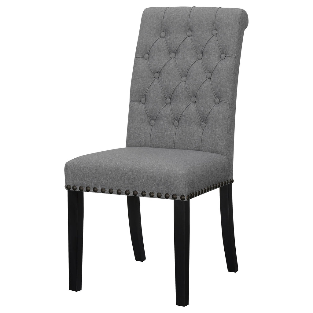 Versatile and elegant, this transitional side chair lends a classical touch to a variety of home decor styles. A rolled backrest with button tufted details lends a traditional aesthetic to a space. Pushing the classic elements is a padded seat with individual nailhead trim that offers a charming detail. Rest easy in this supportive, comfy seat, wrapped entirely in a linen-like fabric that offers a soft touch. Elevated by square shape tapered legs in a rustic espresso finish, this graceful side chair creates a wonderful addition to dining rooms, home offices and more.