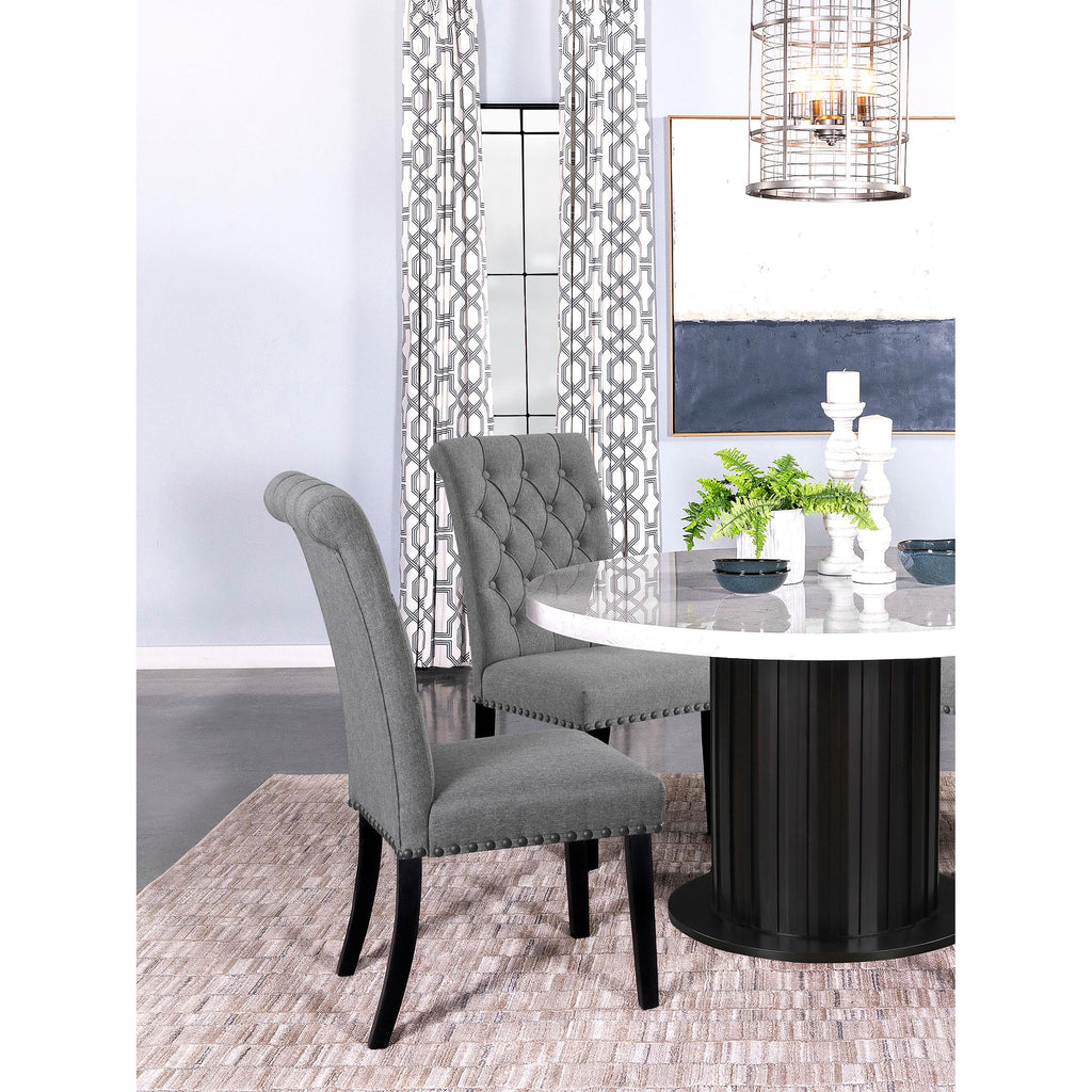 • Transitional side chair with rolled backrest and button tufting