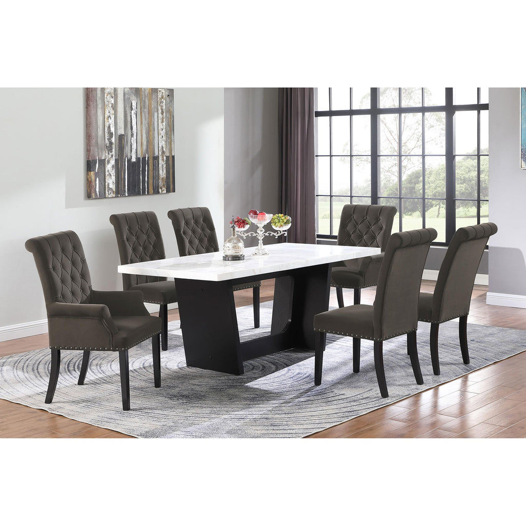 • Plushily padded side chairs are adorned with rolled backs and button-tufted upholstery with bold nailhead trim
