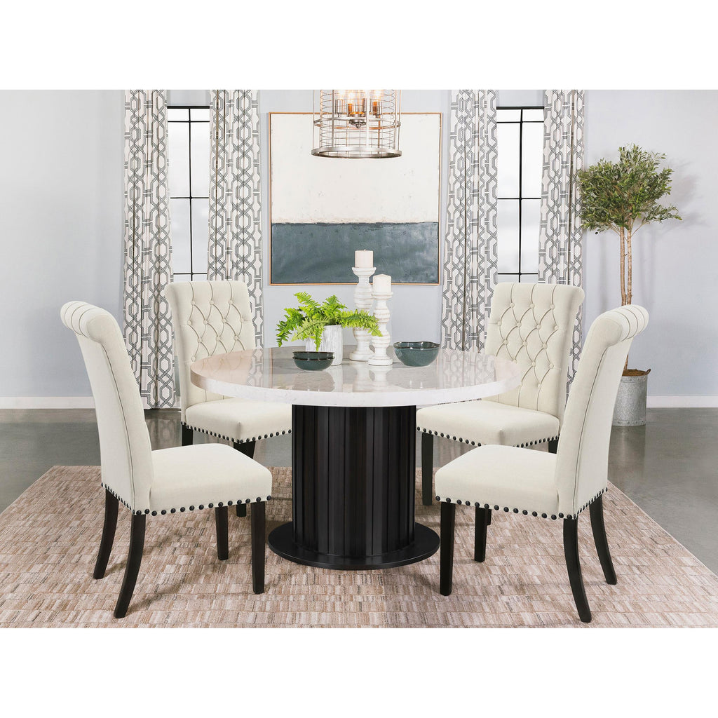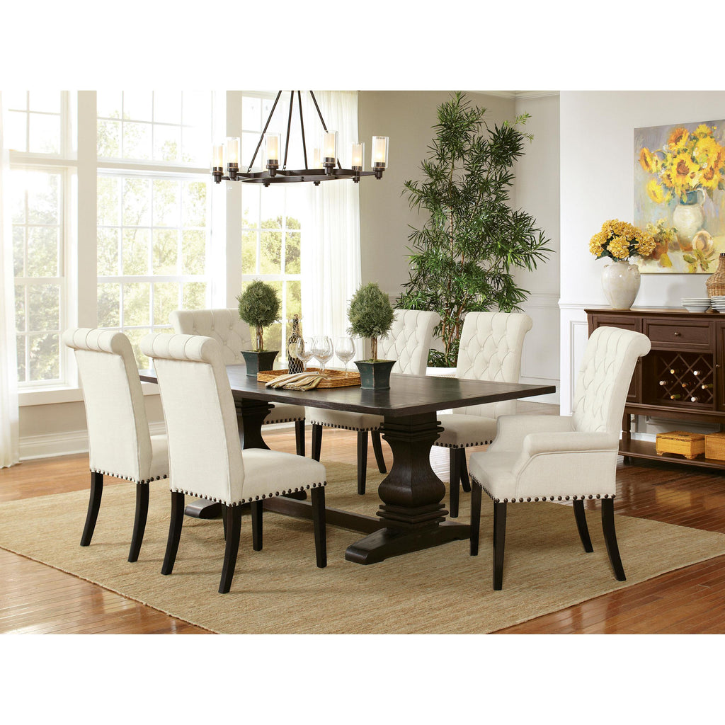 • Plushily padded arm and side chairs are adorned with rolled backs and button-tufted upholstery with bold nailhead trim