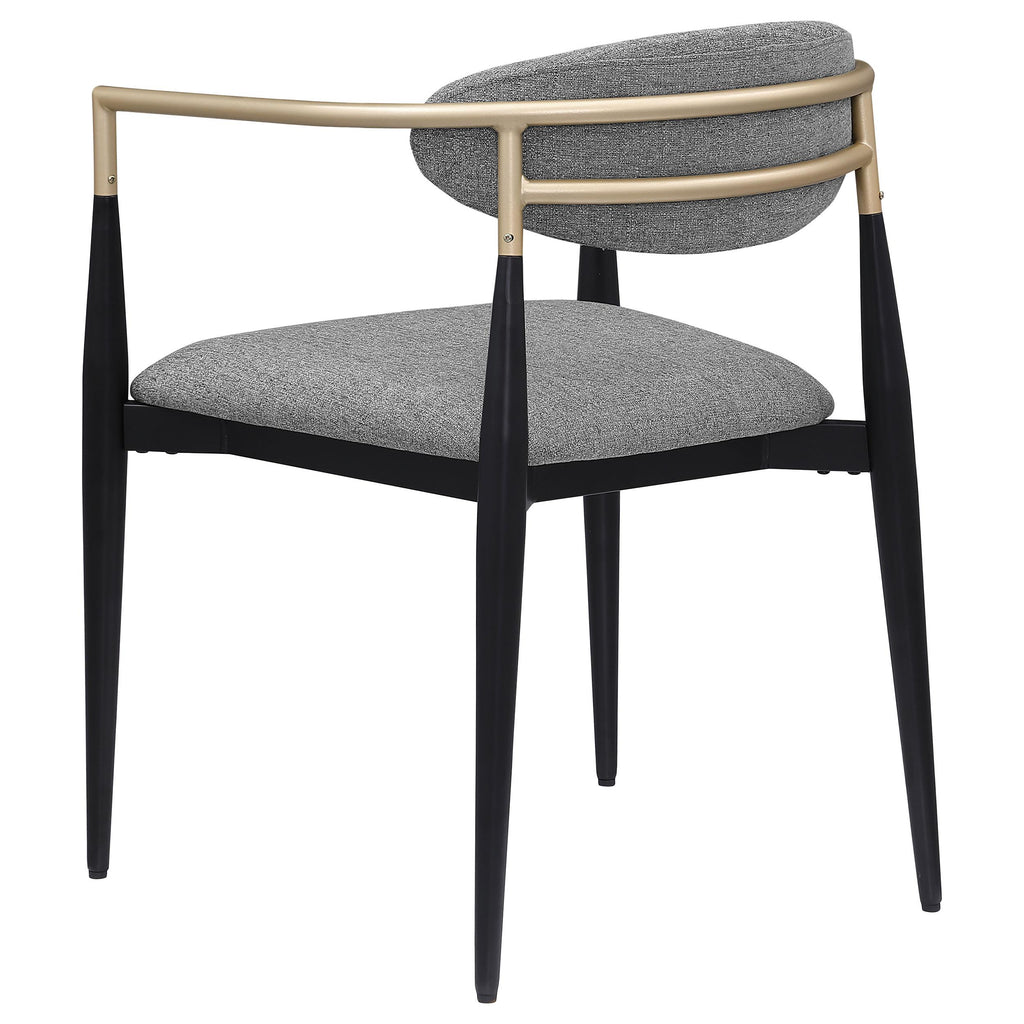 Refresh your dining table with the modern glam flair of a set of two armchairs. Perfect for family and friends, the chair offers impeccable comfort with a padded seat and an oval-shaped backrest with a gentle curvature for excellent support. Its metal frame offers stability and strength, complete with a black powder coated finish. A gold finish is hand-painted on armrests, adding gleaming metallic appeal and warmth. Each chair offers a slim, sleek silhouette, perfect for a modern or mid-century space.