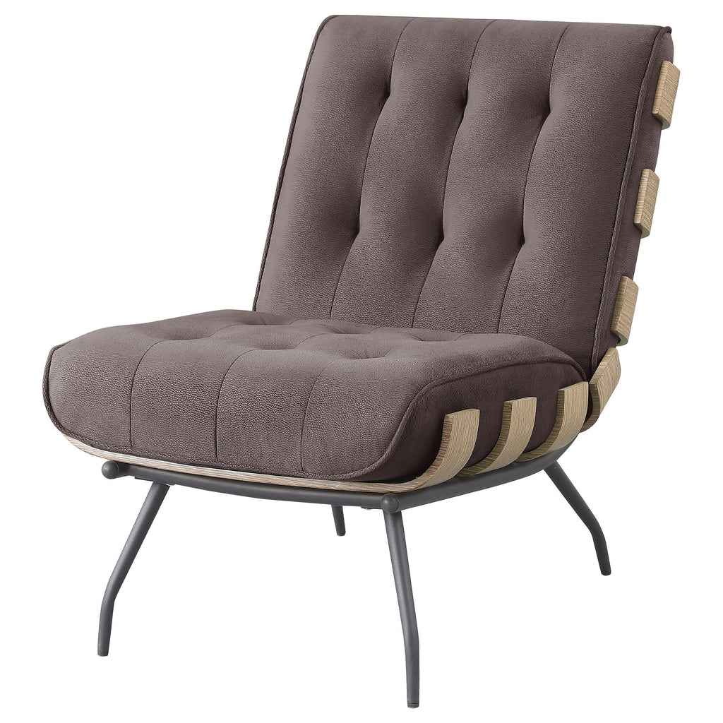 The definition of casual lies in a chic style with a coastal vibe, perfect for accenting your sun porch, living room, or family room. This accent chair features a reworked outdoor lounge chair motif with a seamed and tufted back cushion and an oversized seat cushion. Covered with fabric upholstery, it delivers a bit of freshness to stylize any space. Sit in luxurious comfort on pocket coil spring and foam cushions. Shapely metal legs create a retro-inspired design element.