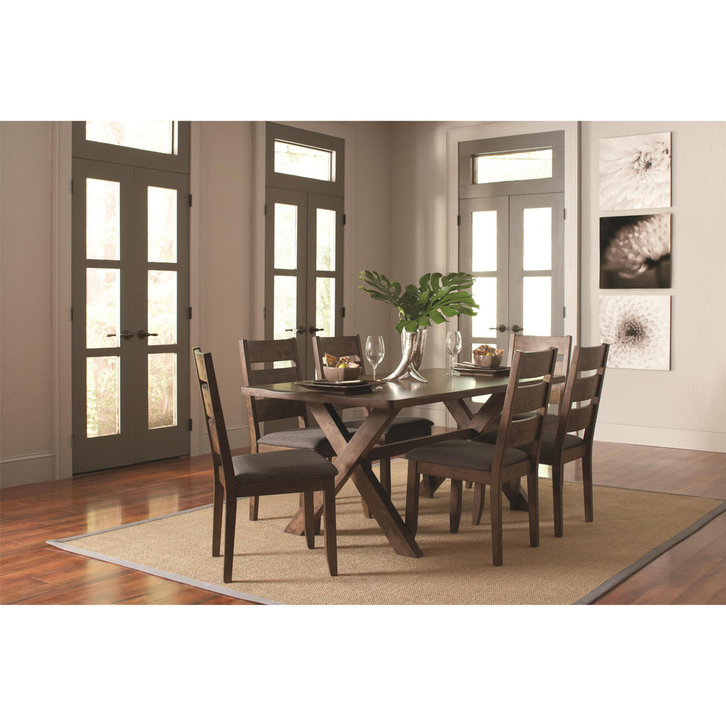 The Alston Dining Set by the Coaster Furniture is made of solid Asian wood coated with a knotty nutmeg finish. The dining table offers X-trestle design base and smooth edges and sleek curves to bring out its industrial style. The matching dining chairs have a ladder back, upholstered seat cushion and tapered legs. This set includes four chairs and one table.