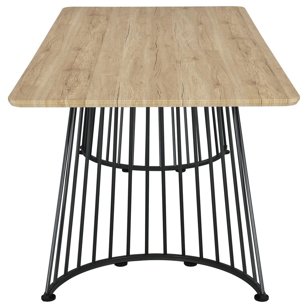 Perfectly suited for a modern farmhouse style home comes this artistic industrial dining table. Situated on dual pedestal bases, featuring a twisted design of staggered thin rods, this dining table presents itself as a unique sculptural piece that catches the eye. Capable of fitting six to eight people, the long rectangular tabletop lends a warmth and spaciousness. Upon the surface is an earthy, natural oak grain with an easy-to-maintain laminate veneer that offers a rustic flair and convenience cleaning method. With contrasting, neutral tones, this dining table complements existing color palettes.