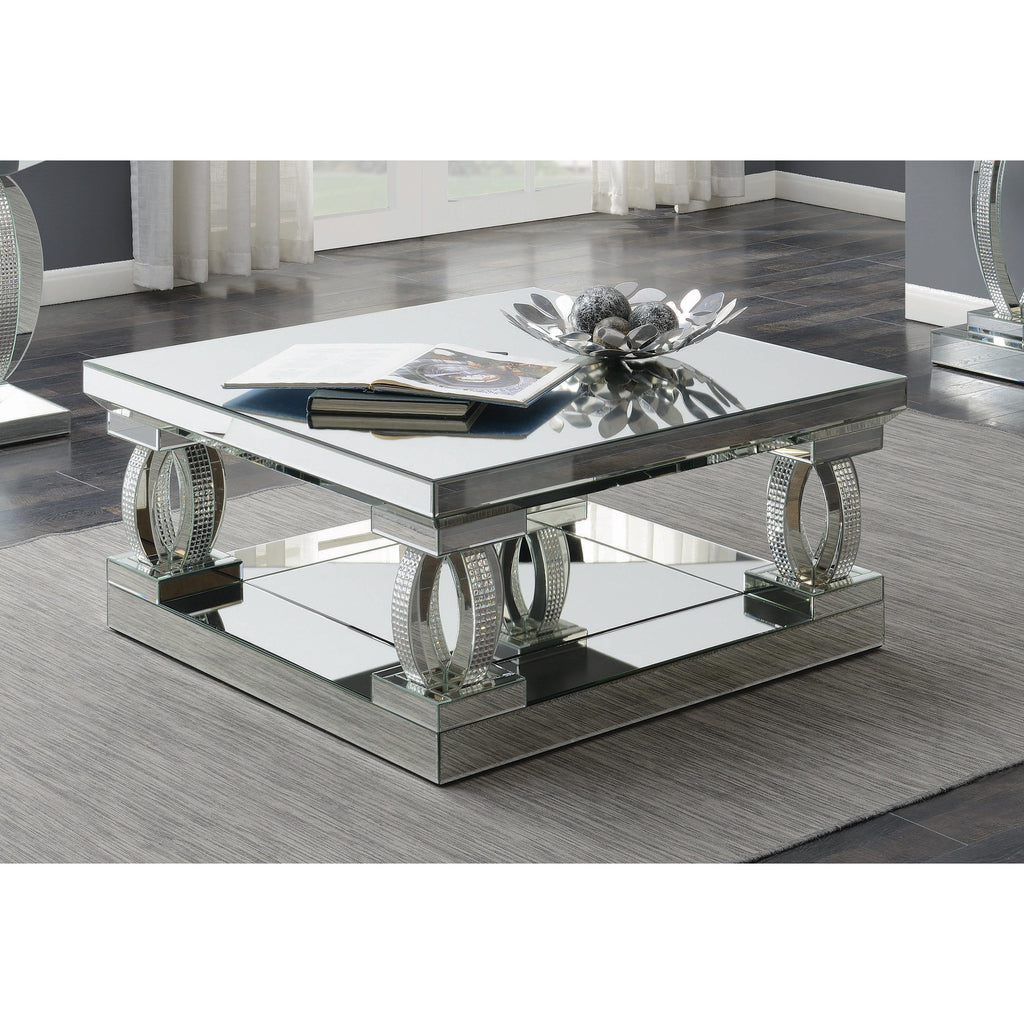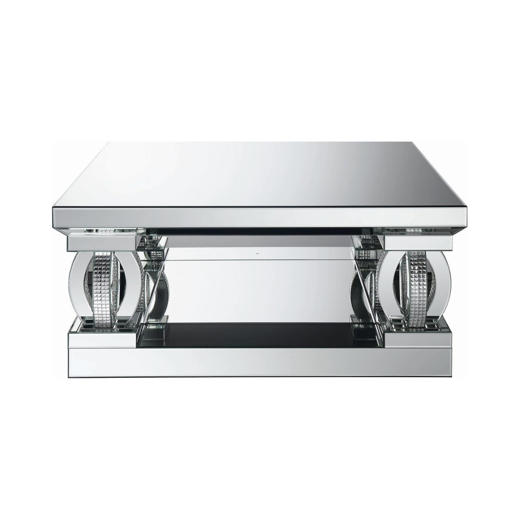 This 40-inch square coffee table brings bold, contemporary style to your living space. With its mirrored surfaces and sturdy construction, it features a large, symmetrical top and matching base for visual balance. Sculptural, oval-shaped supports adorned with rhinestone accents create a glamorous, three-dimensional design. Perfect for displaying decor or hosting guests, this coffee table blends modern luxury with timeless elegance, making it a captivating centerpiece in any living room.