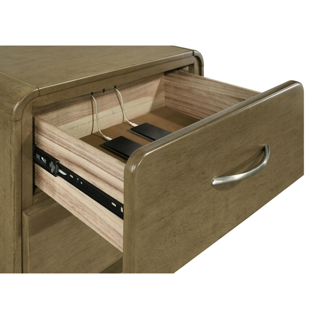 This two-drawer nightstand offers a perfect balance of practicality and modern design. The nutmeg wood finish provides a warm, natural look, while the rounded edges contribute to a sleek, contemporary style. Metal extension glides ensure smooth drawer operation, offering easy access to your essentials. The integrated cord management system keeps your devices organized and within reach. Constructed from solid Asian hardwood, this nightstand is built to last while adding functionality to your bedside.