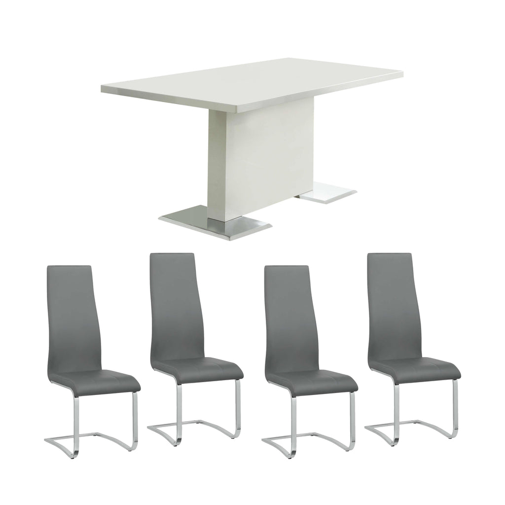 You will love the Anges dining set for your contemporary design dining room. It features a rectangular dining table with a pedestal base and four upholstered chairs with metal legs. This set includes one dining table and four dining side chair.