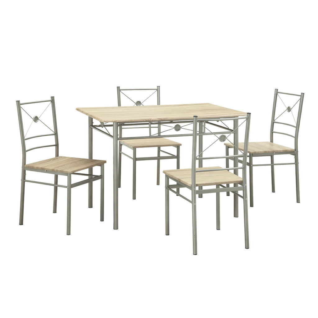 Gather loved ones for a toast around this stylish dining set and create cherished memories to last a lifetime. Constructed from strong metal tubing and high-quality vinyl, it includes four comfortable dining chairs and a rectangular table with smooth, beveled edges. With its compact size, this set works perfectly as a main dining table in a small apartment, or as an additional seating area in a large, well-furnished home. Its transitional design features a crisscross design enhanced by pleasing circular accents. Sleek, graceful lines and a gorgeous, brushed silver finish round out its elegant appearance.