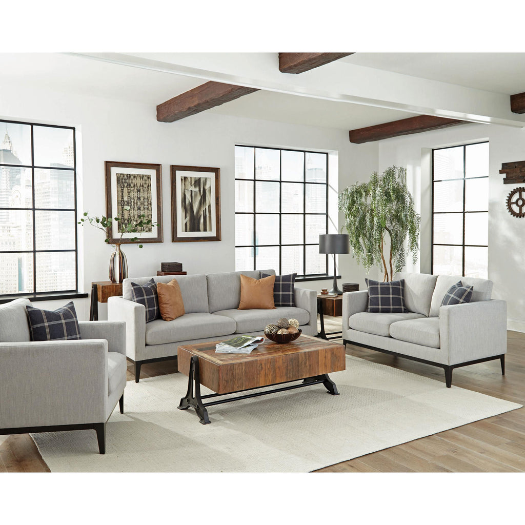 Curl up with a good book and unwind after a long day. This cozy chair is the perfect foundation for casual relaxation. A comfortable back and seat cushion allow for hours of leisurely lounging. Soft, grey upholstery gives it a touch of subtle style. Its simple, dark colored frame cleverly matches its dark accent pillow, balancing out its look with classic glamour.