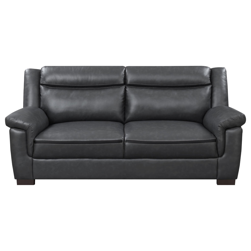 Elevate your living room with this sleek, modern sofa. Upholstered in soft, leathery material, it has a truly sophisticated look. Its comfortable, padded seating promotes soothing relaxation. Subtle stitching traces its frame for an updated touch of style. This sofa is offered in a variety of colors, giving you multiple options to match your decor.