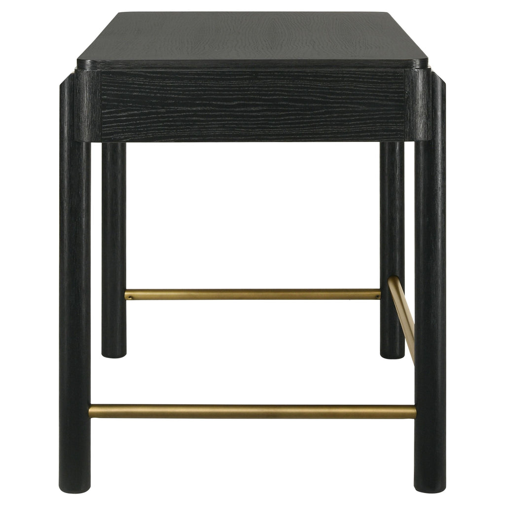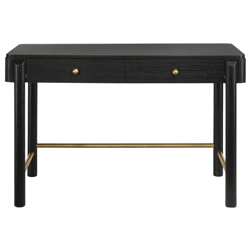 Complete your bedroom or living area with a multi-functional modern coastal vanity desk with a hint of glam personality. Its soft black finish is rich, but neutral, complementing in virtually any setting and showcasing wood grain details. Two drawers create plenty of space, perfect for stashing cosmetics and accessories or desk supplies. Gold finished ball knobs accentuate the drawer fronts, while front legs extend across the desk's apron to create a sense of depth and dimension. Add a mirror to turn this table into a spot for hair and makeup, or bring your laptop and work from home.