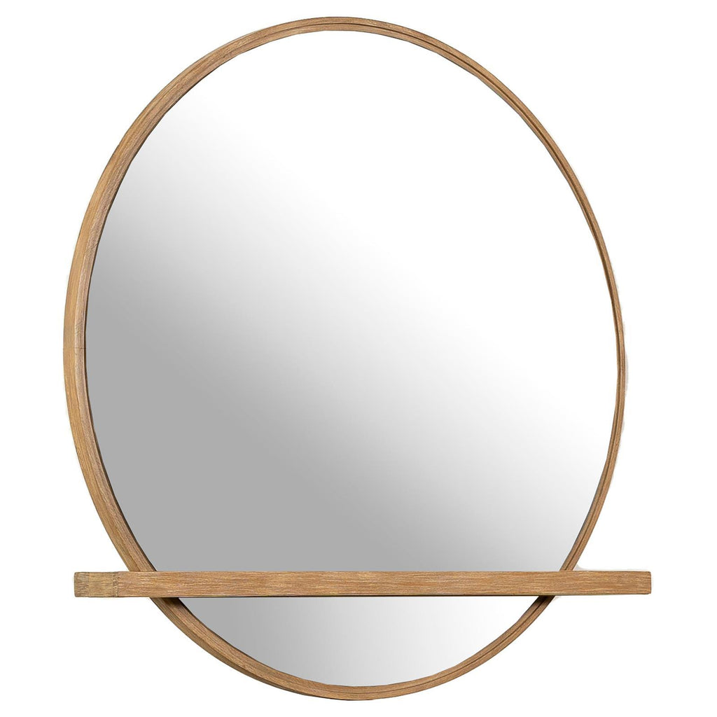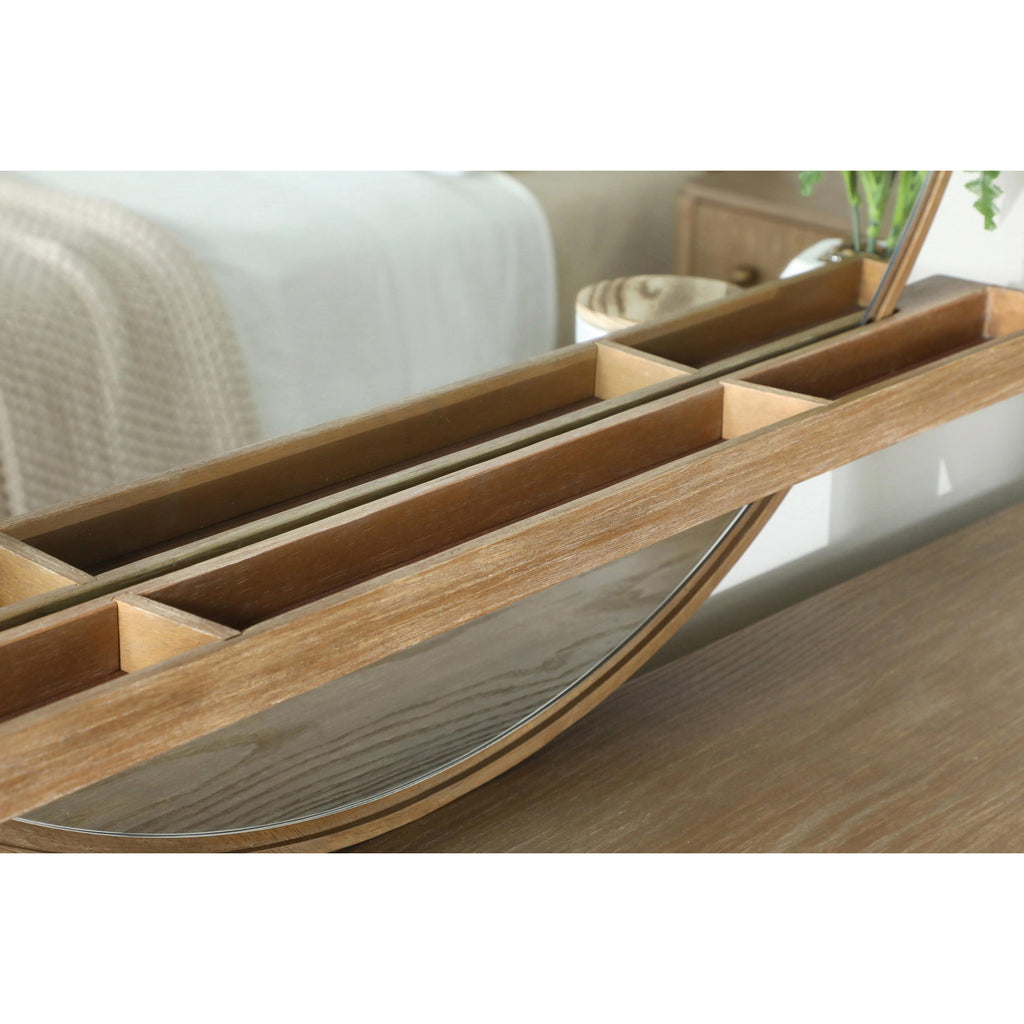 Make the most of your dresser space with this elegant, modern, dresser mirror, designed with a clever built-in tray below and a spacious round mirror above to help you prepare for the day. A wire-brushed sand wash wood frame presents an earthy light tone hue. The felt-lined tray secures jewelry and essentials, keeping a clutter-free dresser surface for restful bedroom retreats.