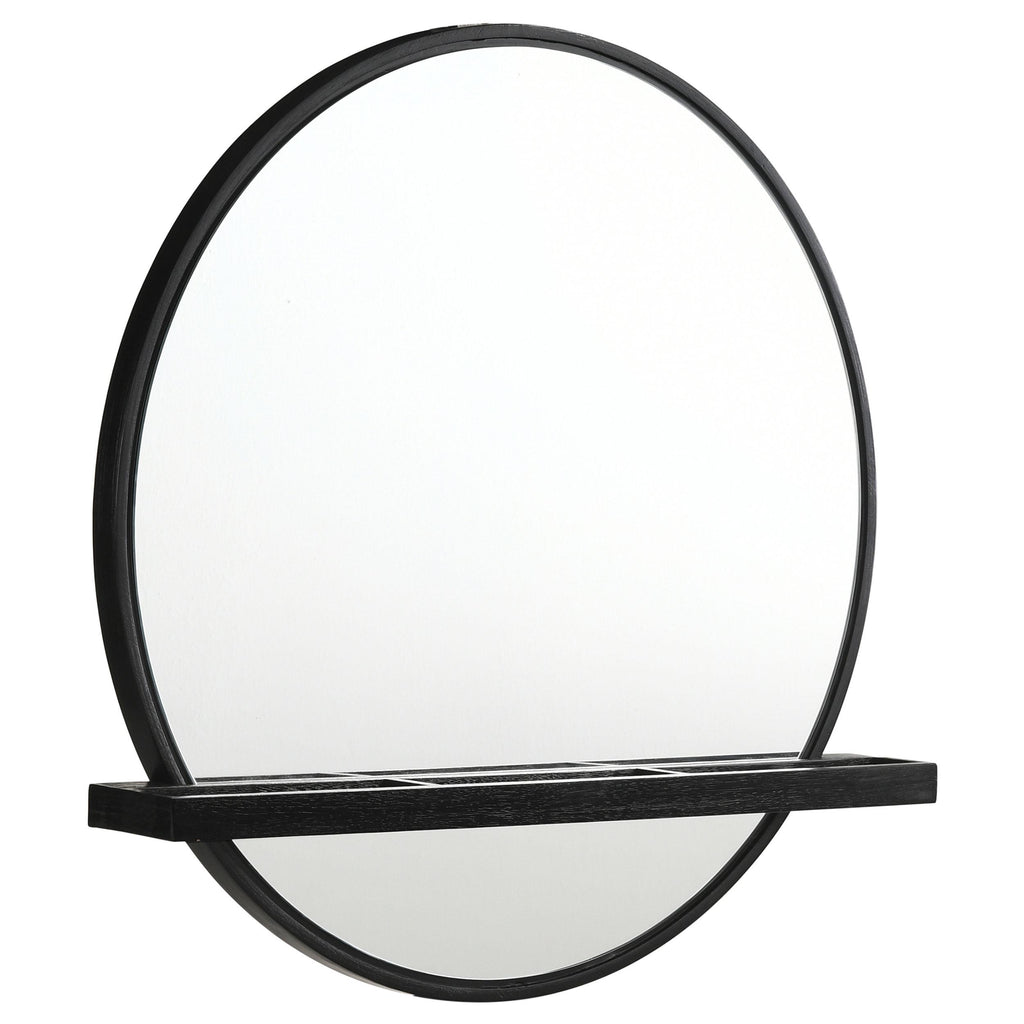 Add a chic vanity mirror over a vanity desk or your dresser to create the ideal place to get ready for the day. The mirror features a round profile with a wooden frame and straight, horizontal shelf. Its black finish is perfect to complement the wood grain look, offering coastal hues that bring neutral warmth. The mirror includes a jewelry tray that's perfectly sized for fragrance bottles and other cosmetics, keeping them close at hand without cluttering your table or dresser top. Even without a table below, this vanity mirror is a chic addition to your bedroom or dressing area.