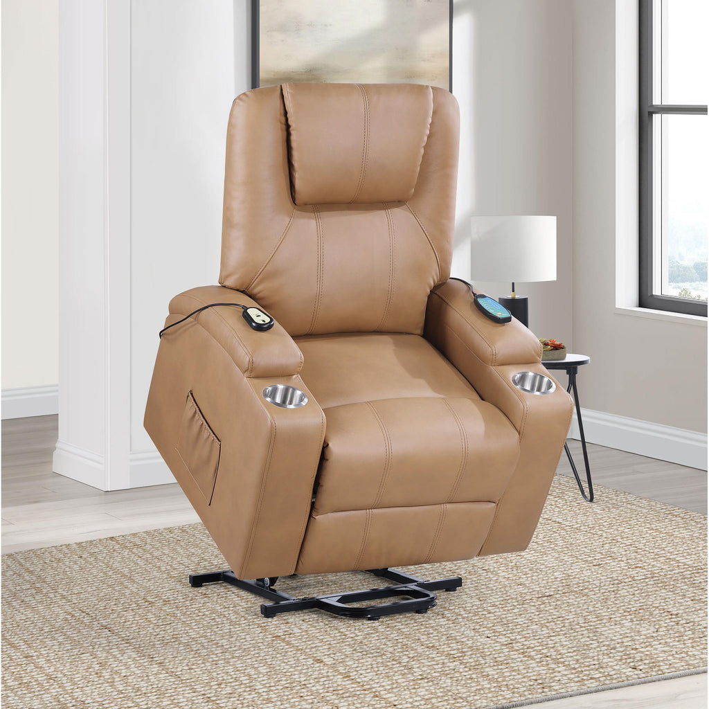 This power lift recliner delivers premium comfort and functionality, perfect for relaxing in style. The chair features luxurious faux leather upholstery and an ergonomic design to support your body at every angle. The power lift mechanism ensures easy movement in and out of the chair, offering assistance for standing or sitting with minimal effort. With integrated cup holders and side storage pockets, convenience is at your fingertips. The chair also includes massage and heat functions, allowing you to unwind and soothe your muscles after a long day. The wired remote control provides effortless operation of all features, from reclining to massage intensity.