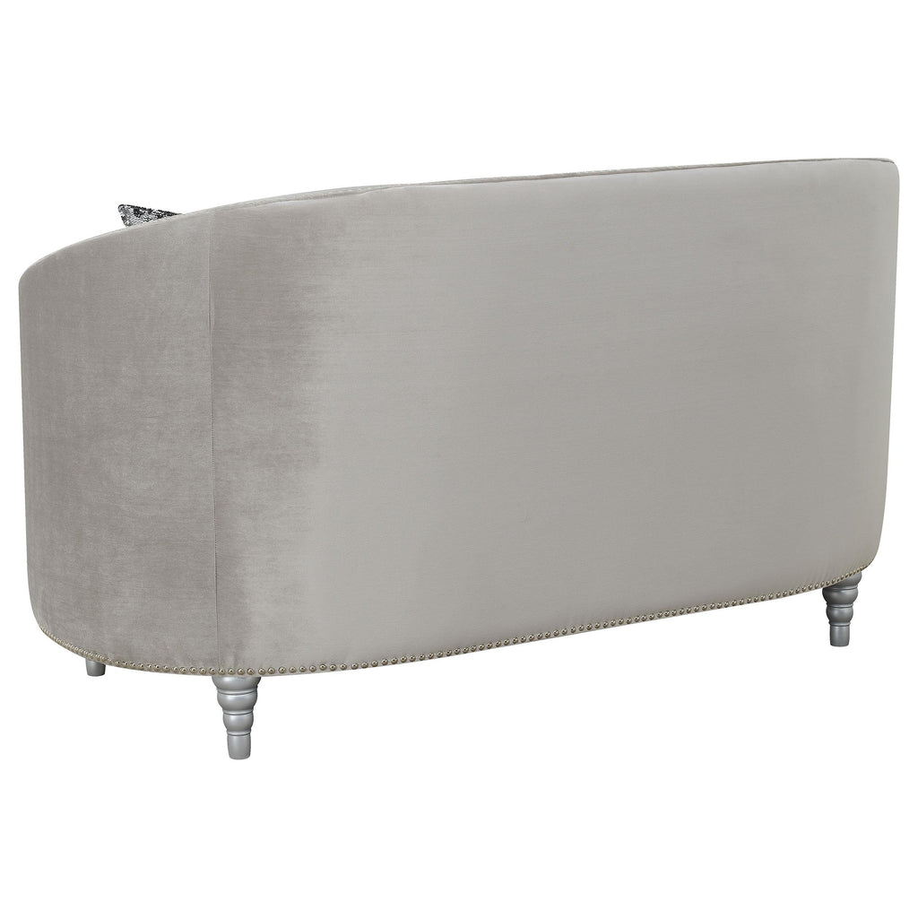 This loveseat envelops you in romantic style and luxury. The button-tufted design is timeless and classic. The wraparound seat back curves down to convenient armrest. Sink into thick cushions for hours peace and quiet while huddled with a book or a partner. Comes finished in impressive grey material that perfectly suits the decor in any living room.