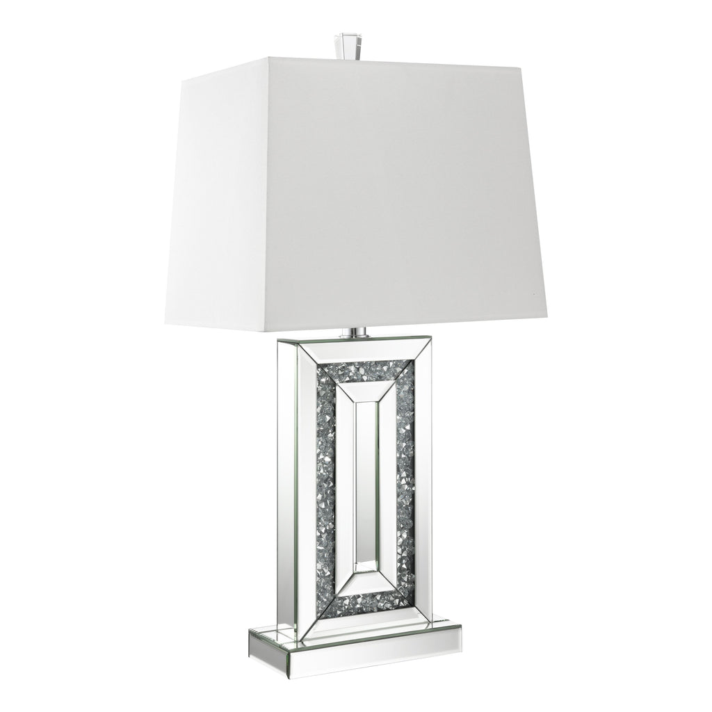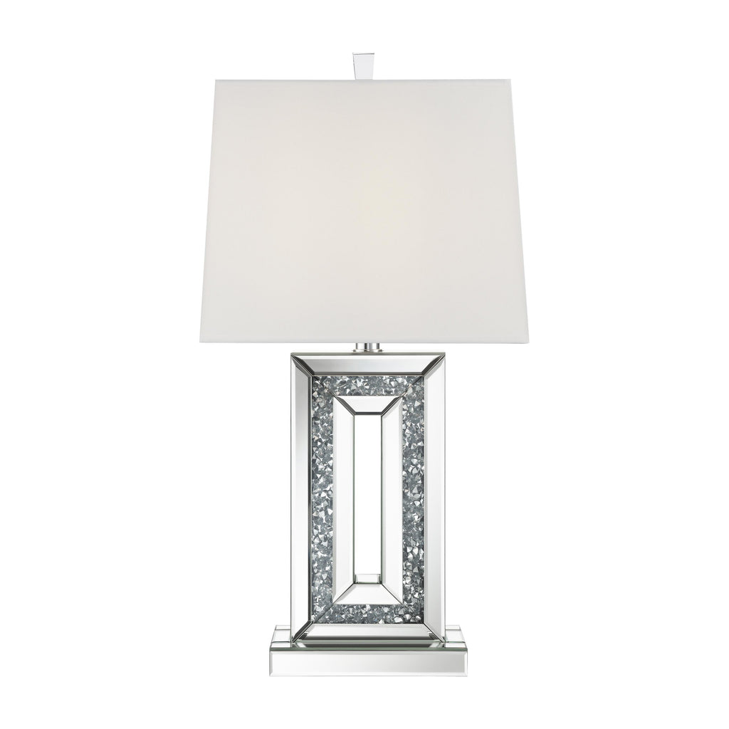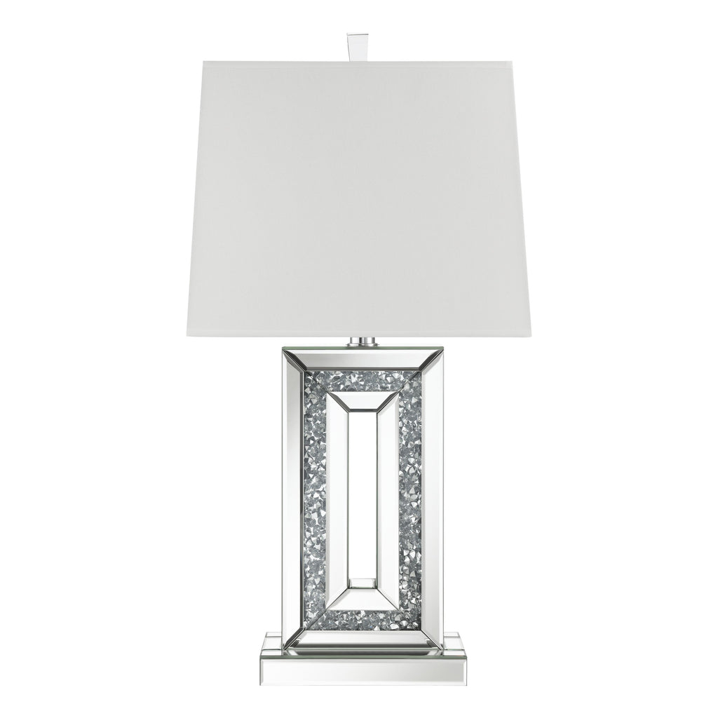 Glimmering dark crystal-like accents emerge from the base interior of this stunning contemporary table lamp. A narrow base outlined in mirror tile accents the edges, creating a beveled look. Mirror tiles also line the flush base, further lending to the reflective, polished nature of the lighting piece. Surrounding the bulb is a square shade wrapped in a white fabric to create a soothing, diffused glow. A transparent acrylic finial tops it all off for one last luxe touch.