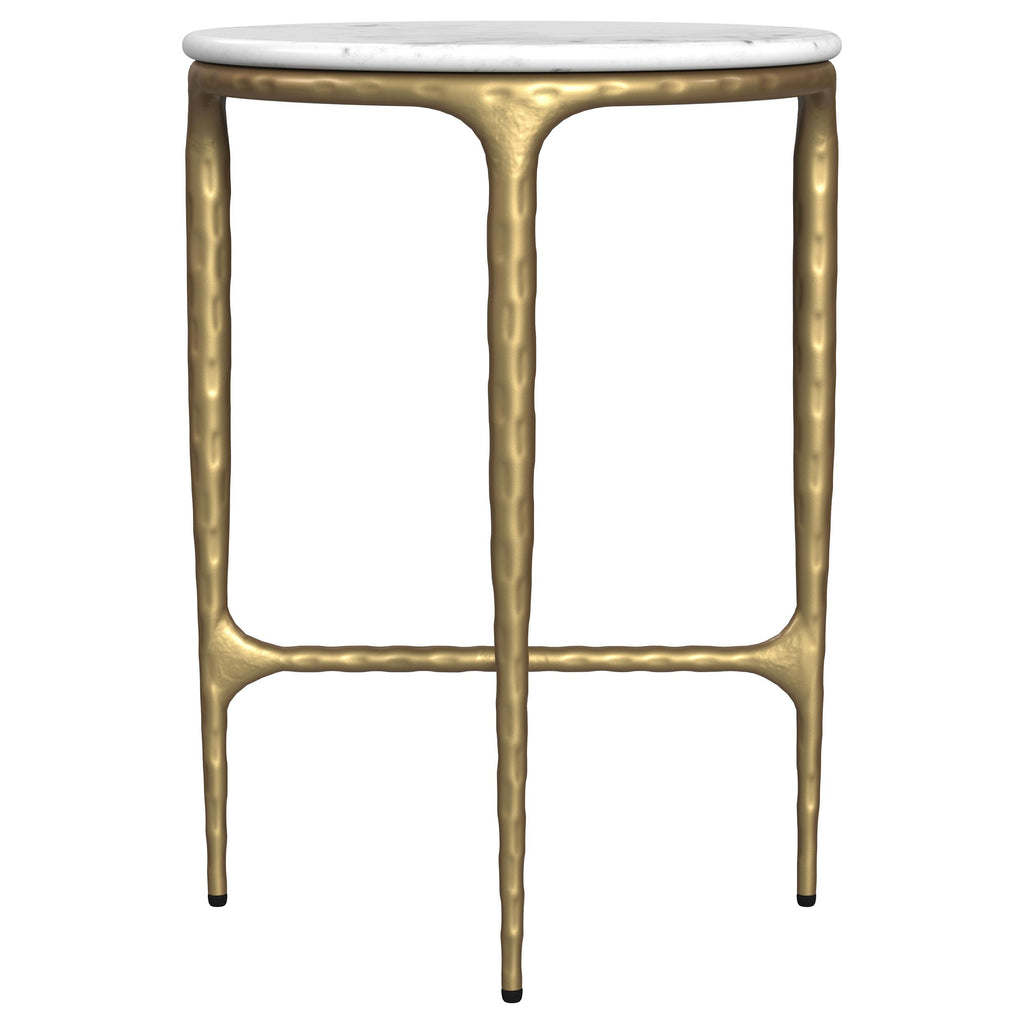 Introduce an artistic touch to your home with this stunning round side table, where luxurious materials and sculptural design meet. The table boasts a genuine white marble top that sits gracefully atop a hand-hammered steel frame with a rich gold finish. The organic texture of the frame adds an intriguing contrast to the smooth marble, offering a piece that’s both functional and visually striking. Perfect for contemporary and eclectic interiors, this round side table arrives fully assembled, making it an effortless addition to your living space.