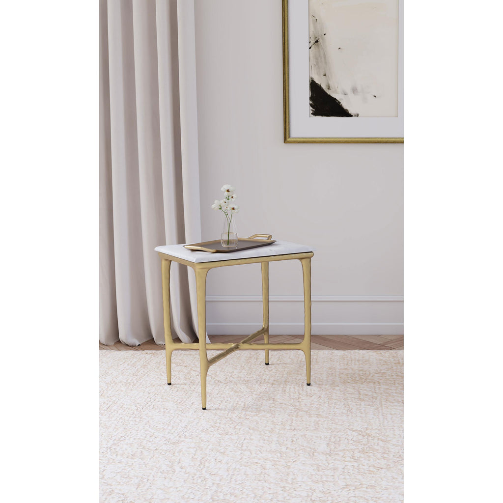 Elevate your living space with the refined elegance of this rectangular side table, where modern luxury meets sculptural design. A genuine white marble top rests on a striking, hand-hammered steel frame finished in a luxurious gold. The organic texture of the frame adds artistic intrigue, while its minimalist silhouette blends seamlessly with contemporary and eclectic interiors. Perfect for making a statement in any room, this fully assembled table combines both functionality and high-end design. Let this side table anchor your space with its sophisticated presence and durable craftsmanship.