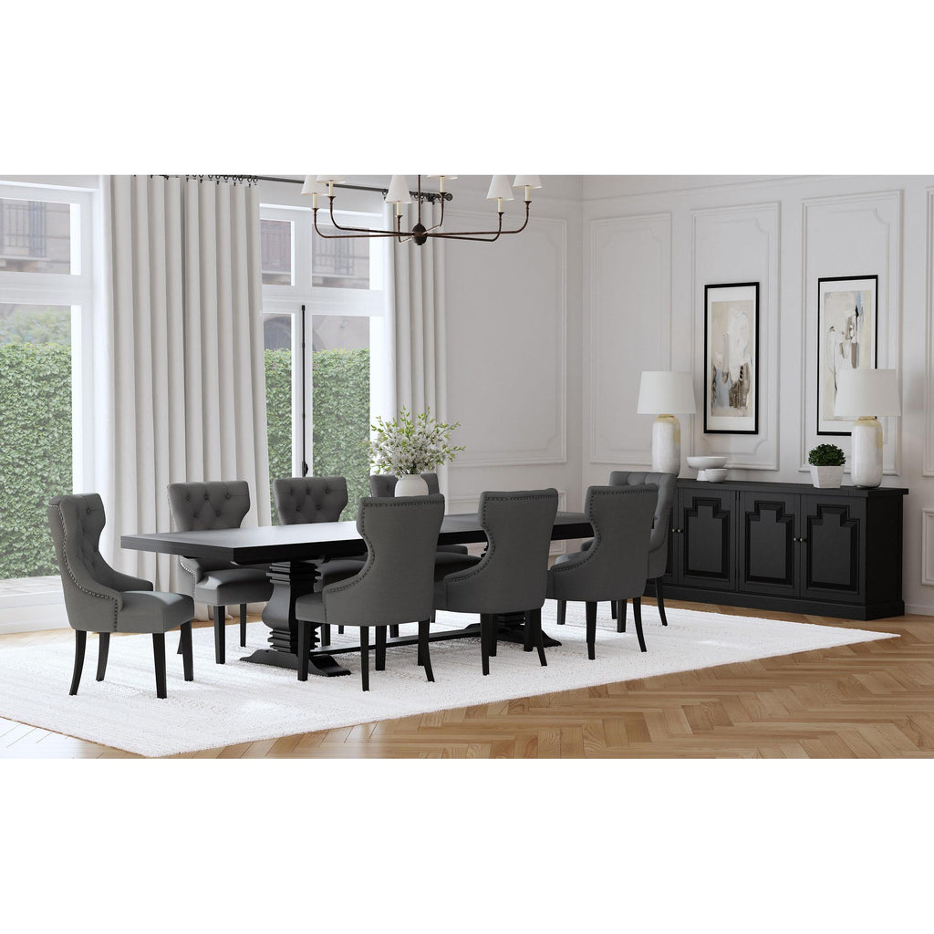 Create an exceptional, inviting dining room space with a modern button tufted dining chair. It pairs a classic wingback profile with a gentle curvature, offering impeccable comfort and chic style. Its plush back and seat feature foam cushioning with soft upholstery, delivering indulgent seating experiences to all who dine at your table. The back of the chair includes nailhead trim that adds a dimensional finishing touch. Black finish legs complete the look with austerity and excellent support.