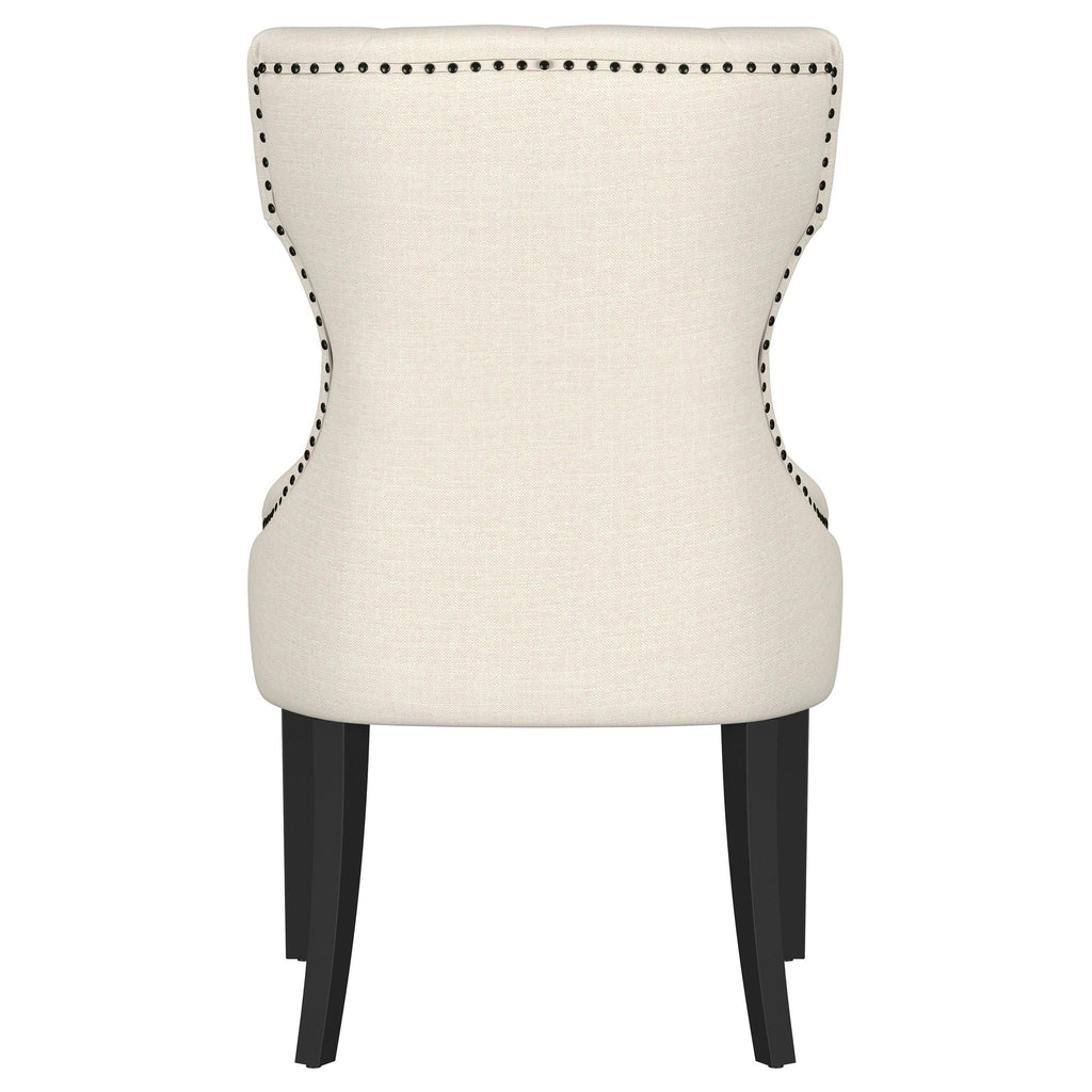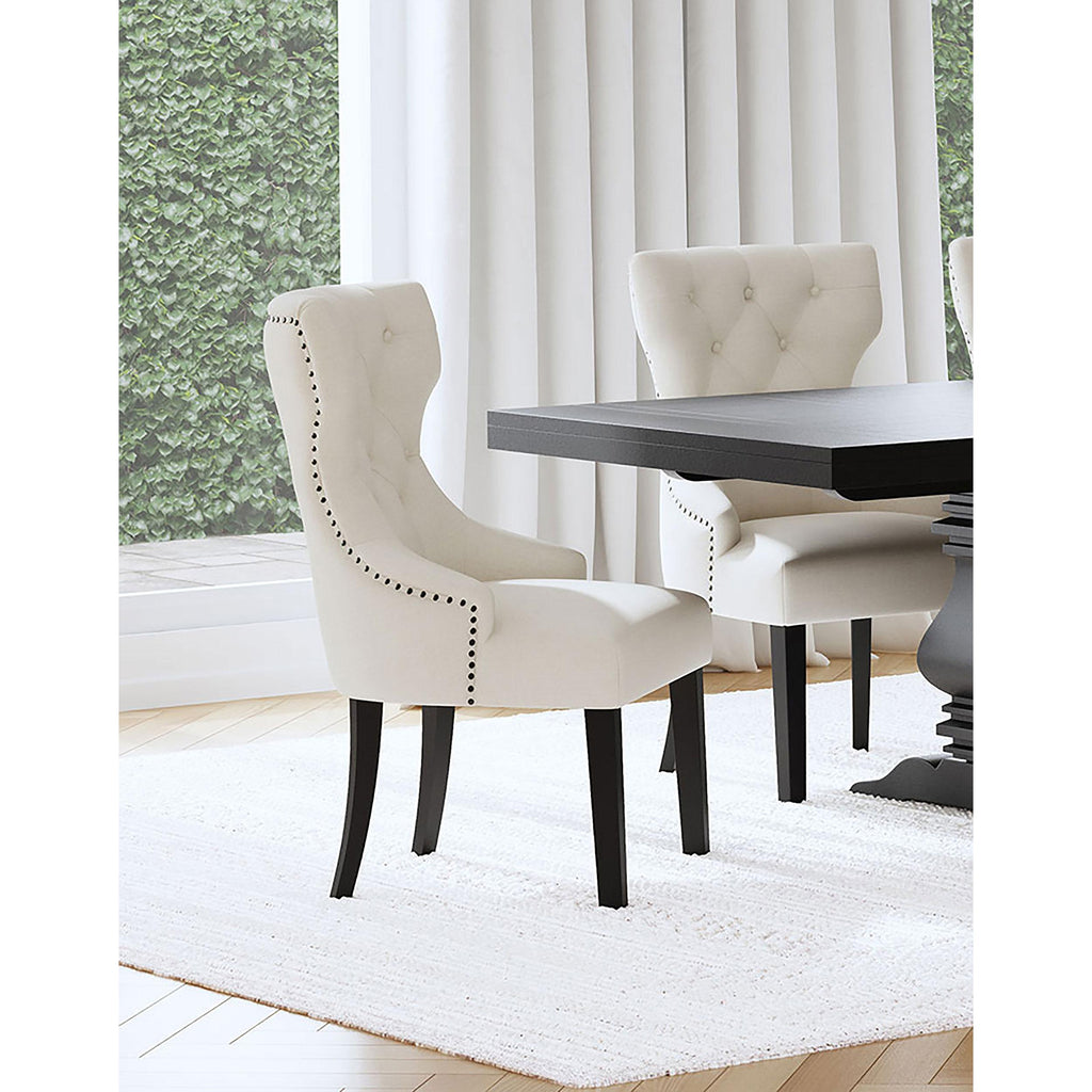 Create an exceptional, inviting dining room space with a modern button tufted dining chair. It pairs a classic wingback profile with a gentle curvature, offering impeccable comfort and chic style. Its plush back and seat feature foam cushioning with soft upholstery, delivering indulgent seating experiences to all who dine at your table. The back of the chair includes nailhead trim that adds a dimensional finishing touch. Black finish legs complete the look with austerity and excellent support.
