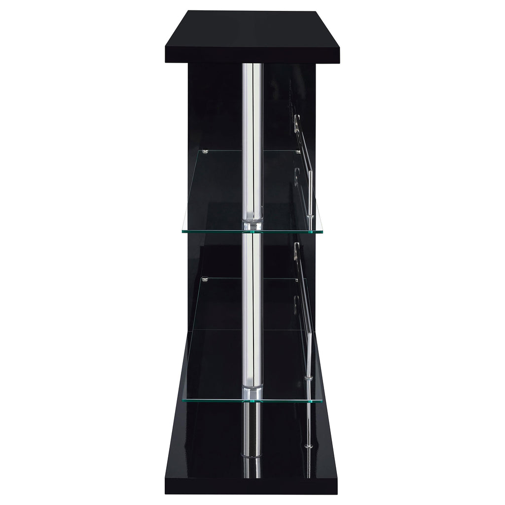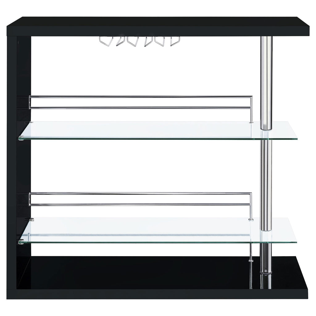 If you love to entertain, you'll love the charm and convenience of this fabulous, contemporary bar unit. With a sleek, stylish design, it looks elegant in a dining area or recreation room. Complete with a gorgeous gloss black finish and shining chrome accents, its bold silhouette makes a striking statement. This handsome unit includes two glass storage shelves for wine, glassware, and bar accessories. A handy wine glass holder rounds out its versatile appeal.