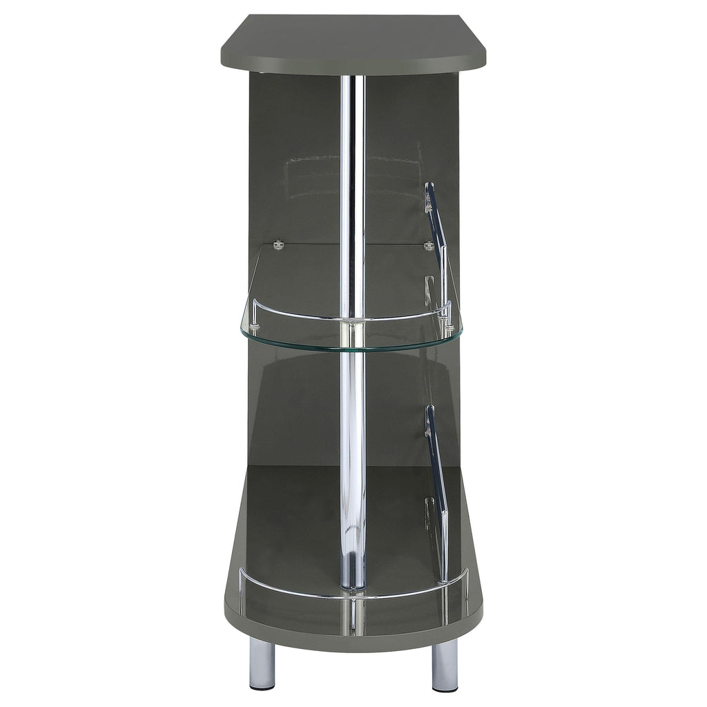 Add a fun retro feel to a modern living area with this contemporary bar table. In a glossy grey finish, the silhouette is cool and neutral. Tempered glass storage shelves offer a clean and open feel while displaying libation bottles in style. Included guardrails help to secure items. Shiny metallic graces the support pole and tapered legs, creating a mid-century modern-inspired look.