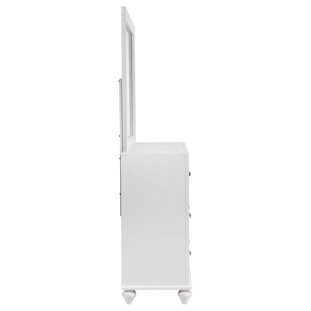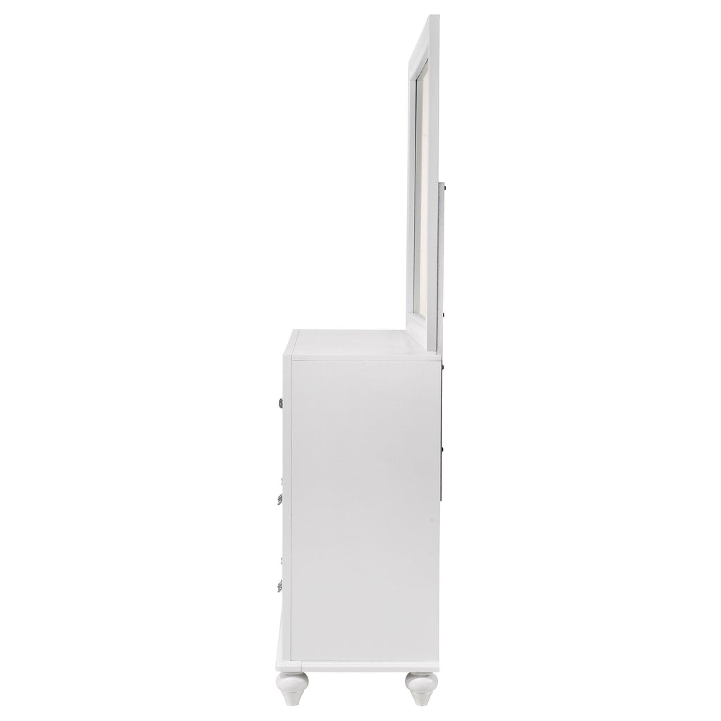 Elevate your space with the ultra-glam charm of this modern dresser and its matching rectangular mirror. The dresser's top drawer fronts dazzle with sparkling acrylic panels, while faceted crystal hardware enhances its luxurious appeal. Its dainty turned feet add a classic touch to the glamorous design, with options in black or white finishes to suit any decor. The beveled wooden frame mirror, in a crisp white finish, offers a light and airy complement to the dresser, bringing elegance and balance to any bedroom.