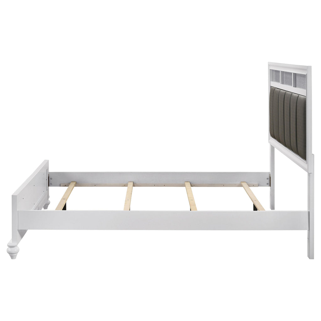 Perfectly suited for more transitional bedrooms, this panel bed features a tall panel headboard and footboard. With a white finished frame throughout, this bed offers extra touches such as channel tufted paneling wrapped in a metallic leatherette upholstery and sparkling accents. The white frame also features molding accents a well as turned feet on the footboard. Place this bed in a primary suite to lend a more glamorous vibe. This bed frame is available in several sizes as well.
