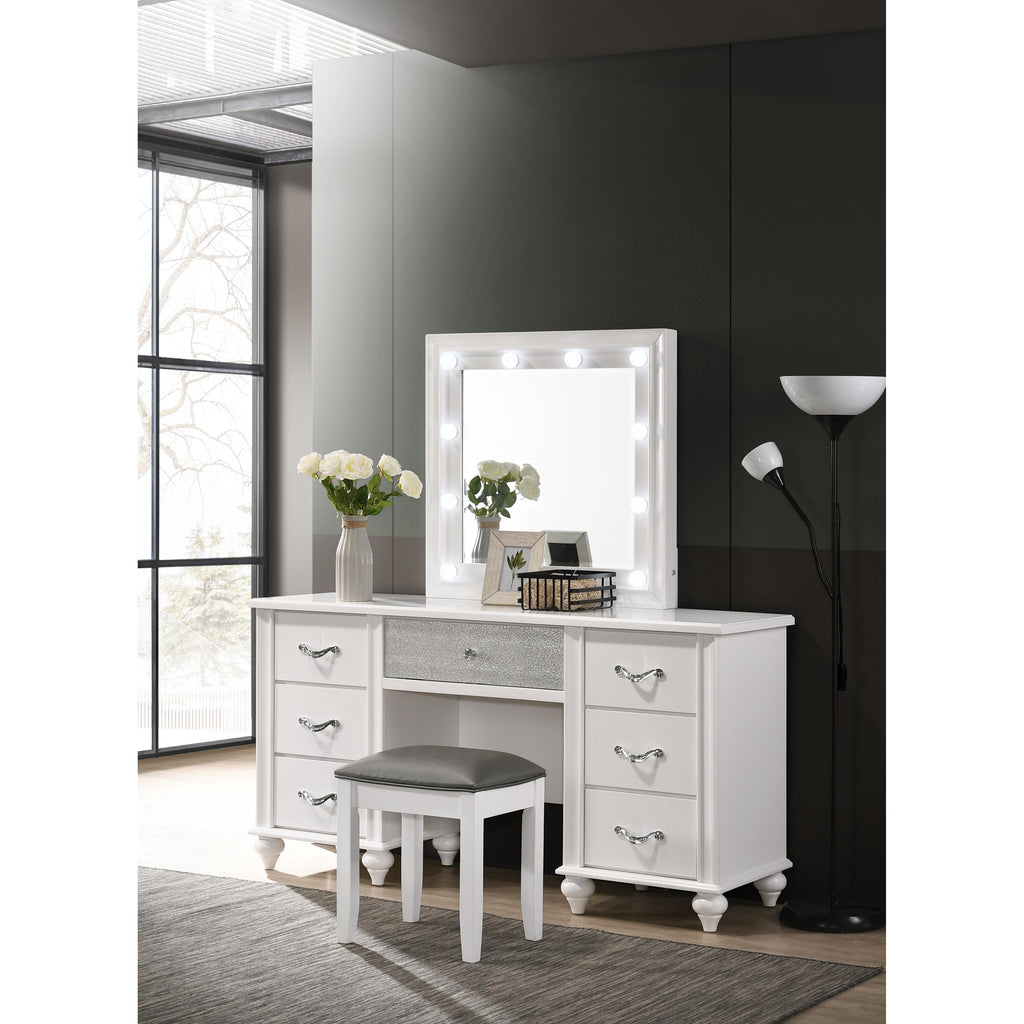 Glam up a modern space with the opulent character of this white vanity stool. Fully contemporary with a touch of vintage silhouetting, its turned legs and thickly upholstered seat top makes this stool versatile and stylish. This vanity stool offers a quaint embellishment in a metallic leatherette covered seat. Perfect for a dressing space, master suite, or main living area, this decadent stool shines with a blend of simplicity and elegance. Crafted of Asian hardwood and wood products and leatherette fabric.