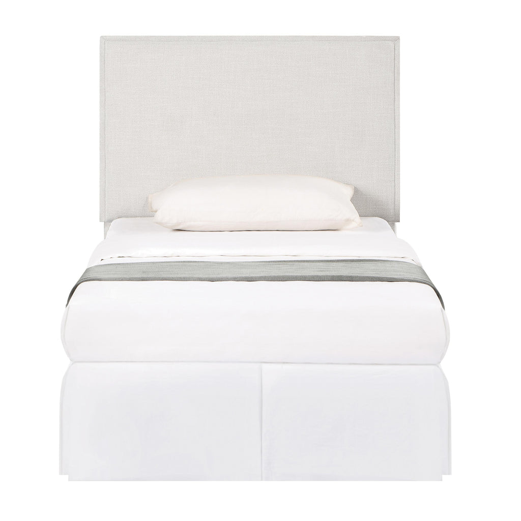 Inspire modern artistry in a contemporary bedroom space with a headboard that shines as a focal point. This updated headboard creates a mix of clean lines and tempting upgrades to transform a bedroom into a haven for relaxation. Versatile and timeless, flange details dress up the outer border, adding a dimensional effect. Textured sand finish fabric wraps over the headboard to deliver a light essence and a palette that accommodates a variety of options for matching case pieces, beds, and accessories. Constructed of pine wood.