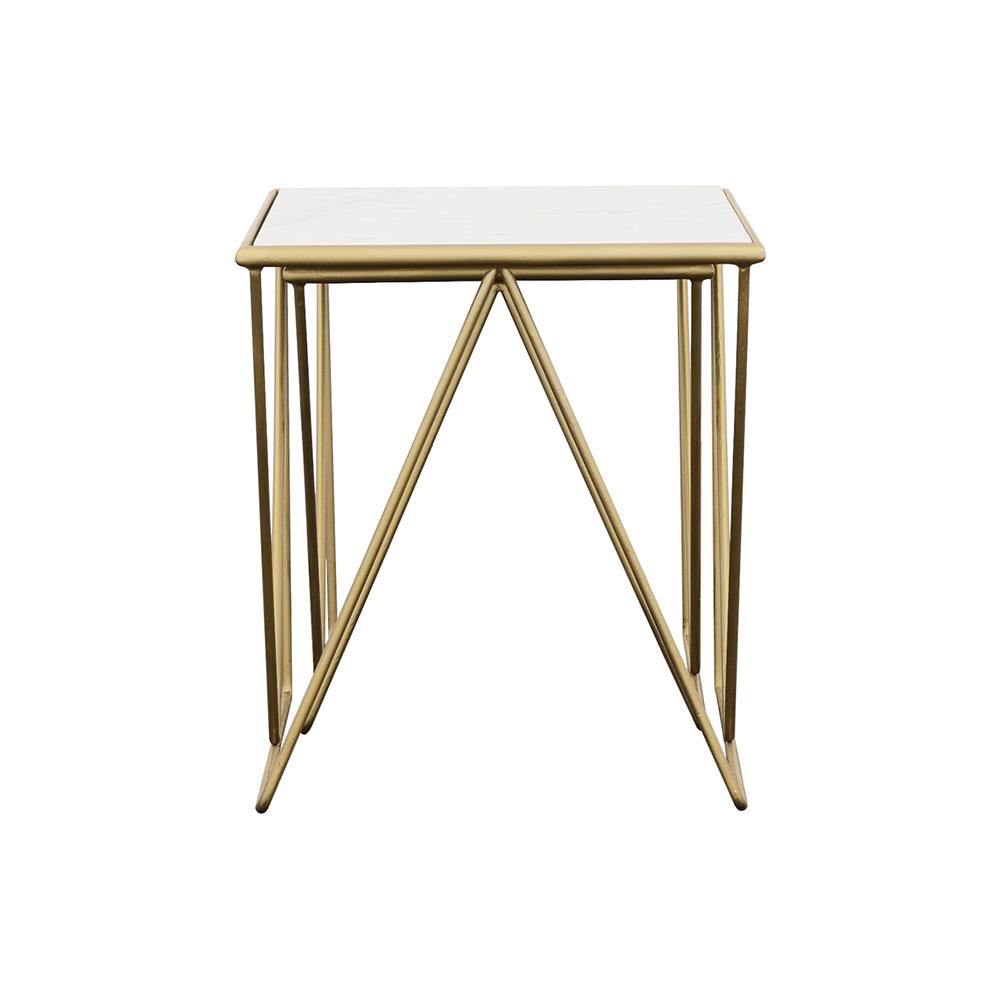 The perfect marriage of contemporary and classic, these modern nesting tables feature a rectangular silhouette. Clean lines are elevated with a white marble top. Sleek and elongated, the metal base features a metallic gold finish. Smooth and elegant, the open base is full of angled lines that bring a sophisticated feel to any living room. Combine rich texture with clean lines to elongate a space with luxury.