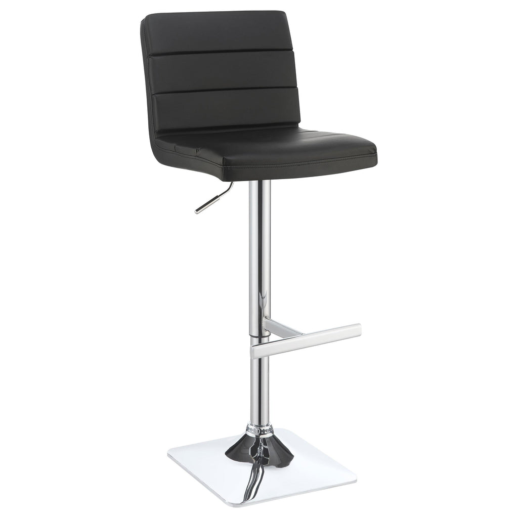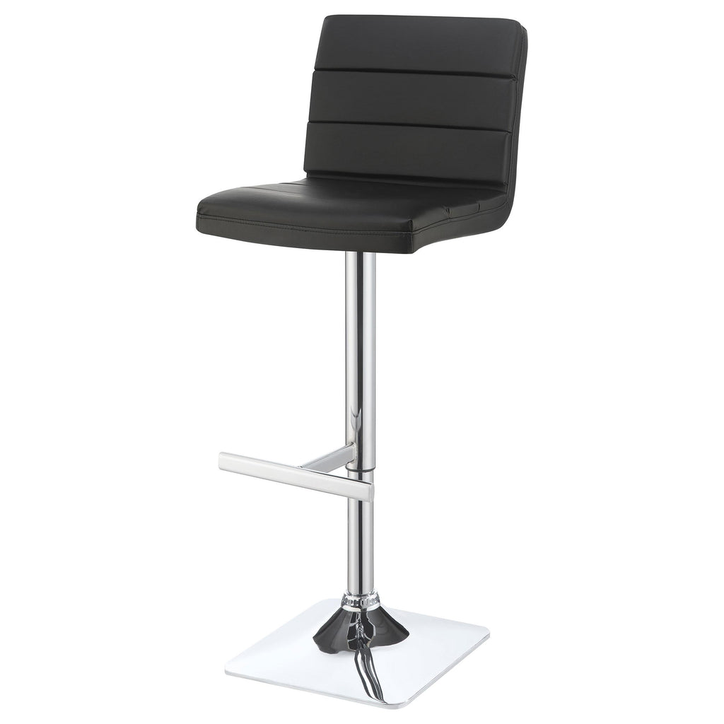 Modern finishes reinforce the contemporary aesthetic of this adjustable barstool. Featuring a height adjustable seat for easy, convenient adjustments to best fit your space. Its seat is upholstered in black leatherette with horizontal stitching that adds depth and detail. A pedestal base features a square foot and a gleaming chrome finish. A T-shaped footrest is built in, offering easy relaxation for a quick bite or a leisurely night cap.
