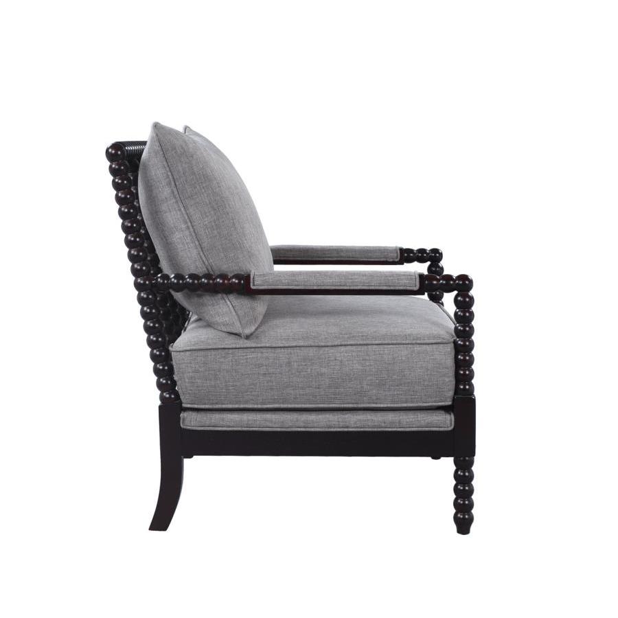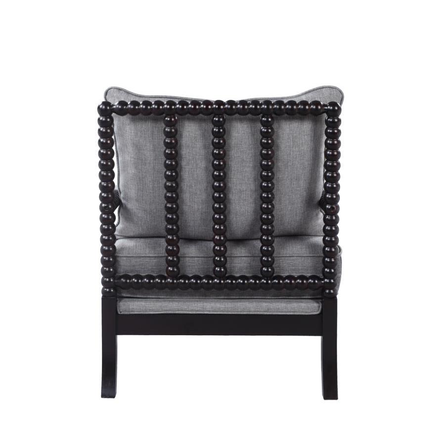 Careful attention to design detail brings a truly stylish look. Ornate elements on this accent chair offer an artistic feel that blends easily in a transitional space. A slender frame with a black finish features sweet beading to deliver romance and attitude. A lovely grey upholstered seat base and back pillow keep it simple and elegant. Stylize a family room or den with this charismatic chair.